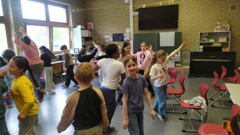 Die Klasse 2b tauchte mit MUS-E® Künstlerin Kerstin Kiefer in die Welt des Theaters ein und entdeckte die vielen Möglichkeiten jenseits von Richtig und Falsch. In einem bewertungsfreien Raum wurden die Kinder zu Forscher:innen, die frei experimentierten und spielerisch die Grundlagen des Schauspiels erkundeten. Mit verschiedenen Übungen zur Körperwahrnehmung, zur Bewegung im Raum sowie zu Mimik und Gestik erweiterten sie ihr Ausdrucksvermögen. Sie erhielten erste Einblicke in die Stimmbildung und erforschten, wie vielfältig sich Gefühle darstellen lassen. In kleinen Szenen, die sie selbst entwickelten, schlüpften sie nicht nur in die Rolle der Schauspieler:innen, sondern auch in die der Regisseur:innen.