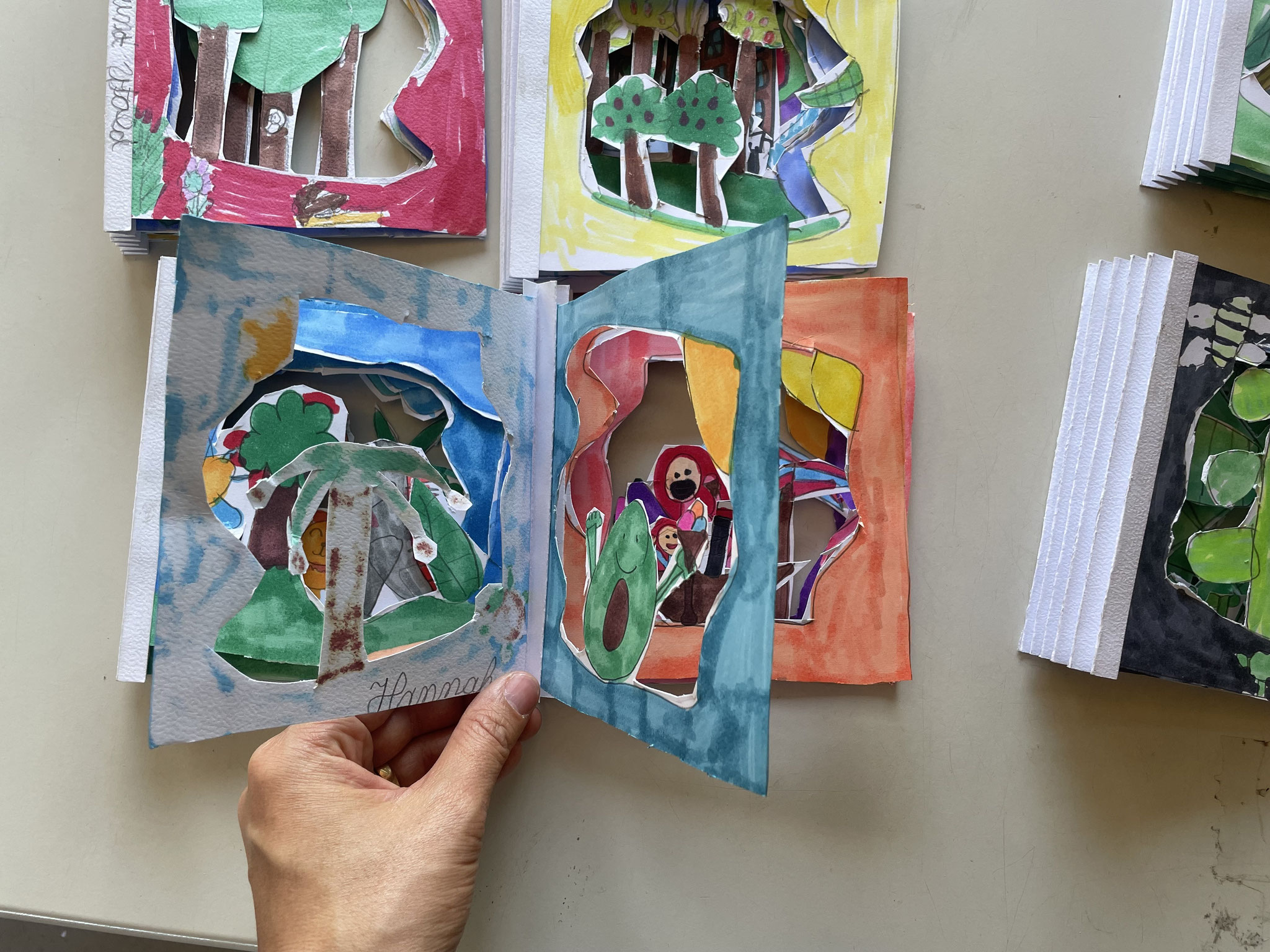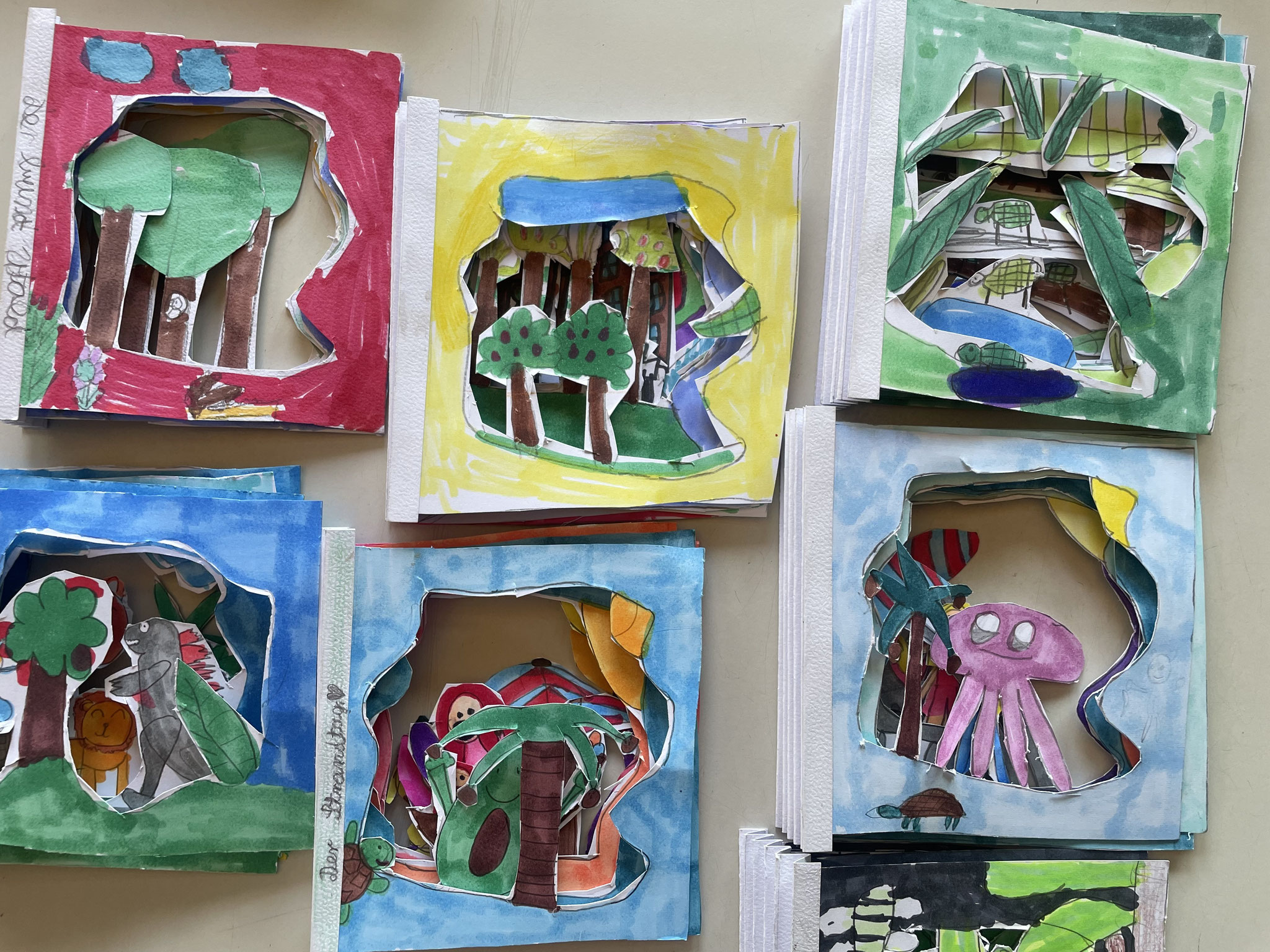 Mit Stempeltechniken, bei denen Blätter und Blüten zum Einsatz kamen, eröffneten sich den Kindern neue kreative Möglichkeiten. In den folgenden Projekten wurden Bücher durch Faltungen und Papierschnitte kreiert und Traumhäuser gestaltet, die sowohl innen als auch außen detailliert bemalt wurden. Ein besonderes Highlight war das Tunnelbuch, bei dem Landschaften aus Pflanzen und Tieren entwickelt und die Zwischenräume ausgeschnitten wurden, sodass man die Details der nächsten Seiten wie durch einen Tunnel sehen konnte. Zum Abschluss bastelten die Kinder aus Karton ein Mäppchen für ihre zweidimensionalen Kunstwerke, das sie mit Collagetechniken aus Tonpapier verzierten.