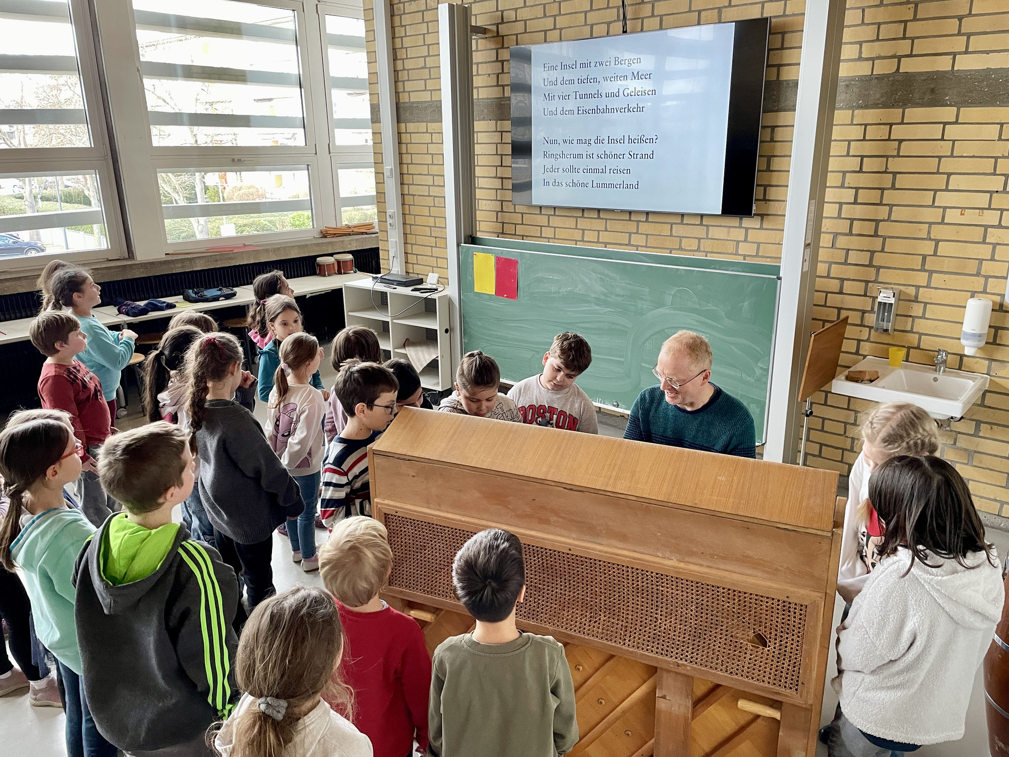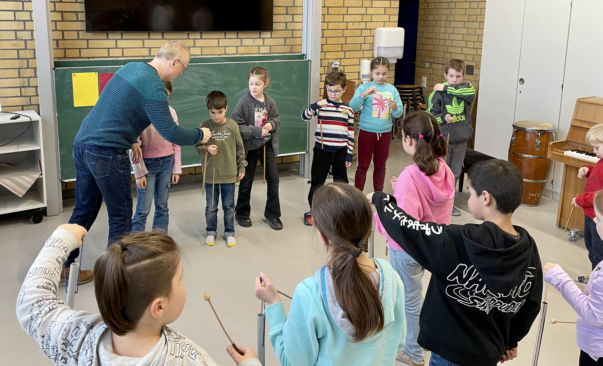 Mit Orff-Instrumenten simulierten sie eine Schlittenfahrt und lernten, wie sie mit Xylophon-Tönen einen Parcours vom Grundton bis zur Quinte bauen und spielen können. Besonders wurde auch auf das Bewegungsbedürfnis der Kinder geachtet. Katharina Gross nutzte das alte Orchesterglockenspiel, um den Schüler:innen das Unterscheiden zwischen chromatischen und diatonischen Farben beizubringen. Mutige Kinder improvisierten sogar an einem Tag auf der Gitarre für die Klasse. Das Navajo-Steinspiel erfreute sich ebenfalls großer Beliebtheit und die Schüler:innen erlebten verschiedene Taktarten beim Dirigieren.