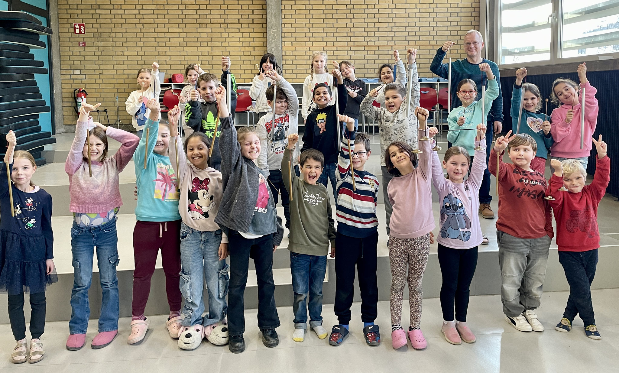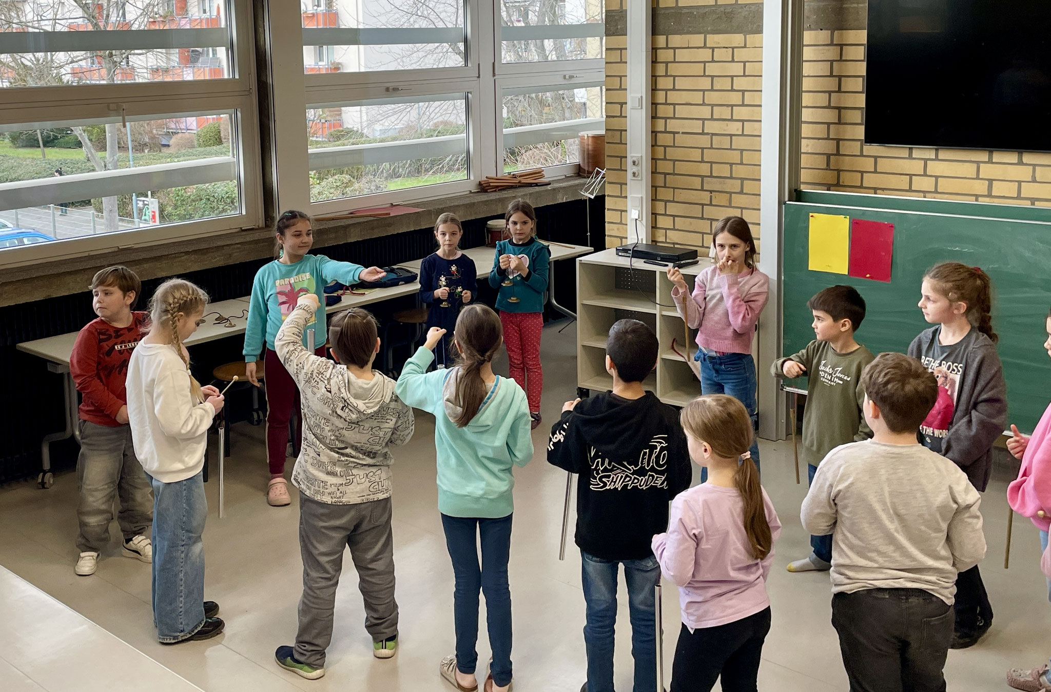 Im Zentrum der MUS-E® Einheiten der Klasse 2a mit Johannes Santos stand das aufmerksame Hören, eine Fähigkeit, die in einer reizüberfluteten Welt für Kinder immer wichtiger wird. Spielerisch übten die Kinder, leise und fokussiert zu lauschen, und entdeckten dabei eine Vielzahl neuer Klangerfahrungen. Alltagsgegenstände wie Hölzer, Gläser, Flaschen oder Materialien aus dem Schulranzen wurden zu Klangquellen. Papier raschelte oder riss, Gummis verwandelten sich in Saiteninstrumente, und aus Strohhalmen erklangen überraschend Oboen-Töne. Im weiteren Verlauf lernten die Kinder Percussion-Instrumente und Klangröhren kennen, experimentierten mit Lautstärke, Tempo und Klangdauer und probierten pulsierende sowie flächige Klänge aus.