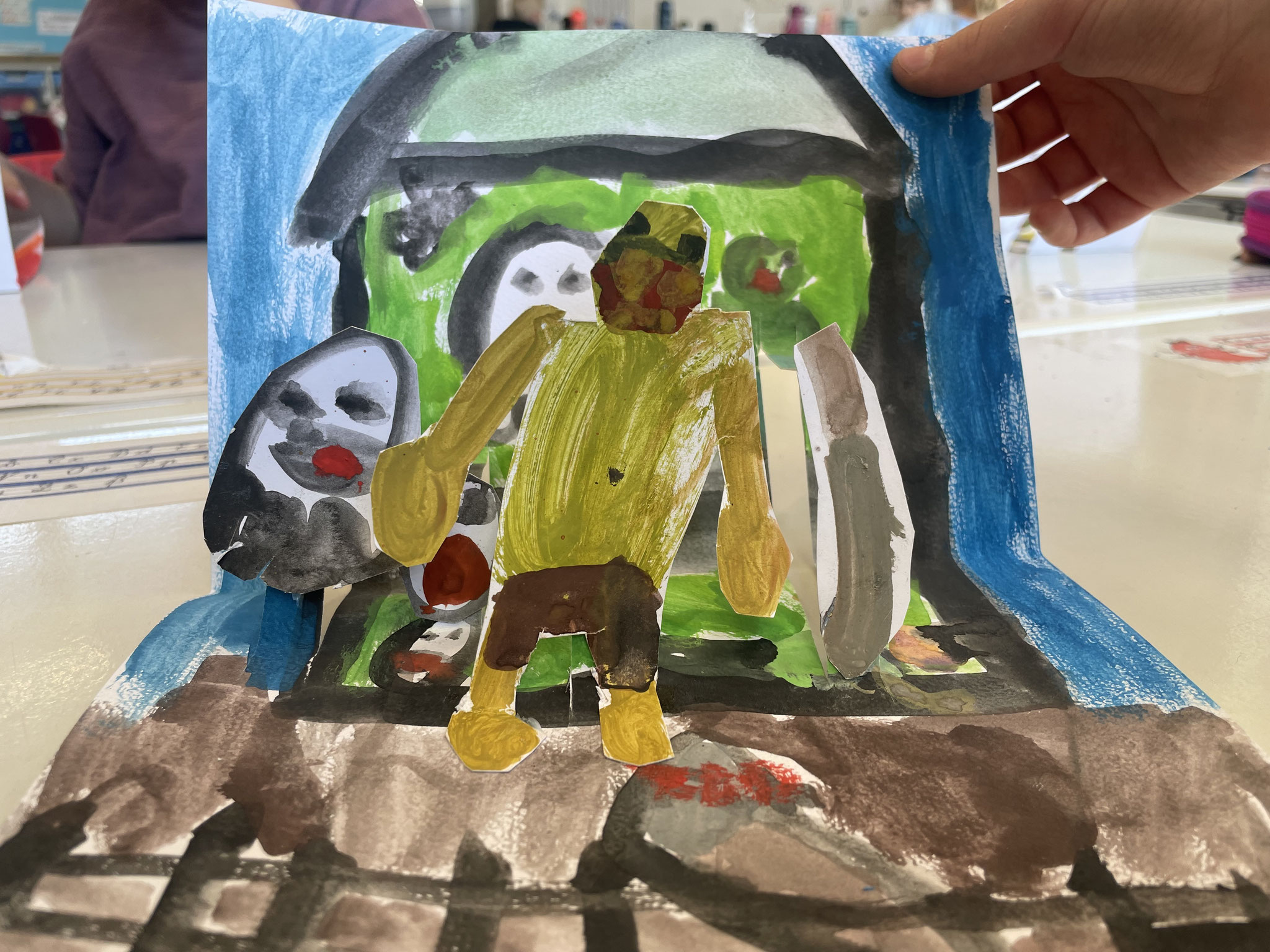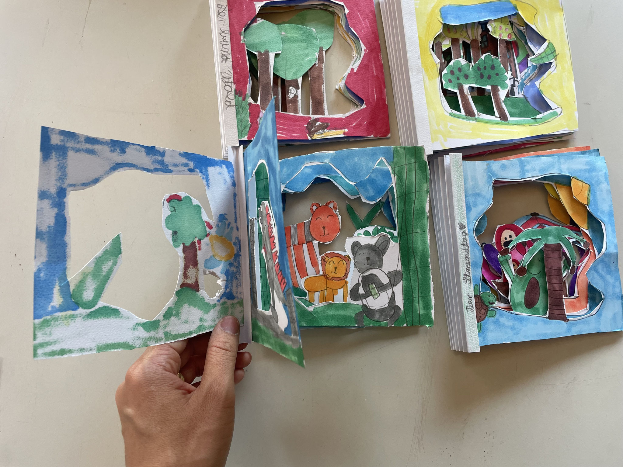 Die Schüler:innen der Klasse 2b experimentierten in diesem Halbjahr mit MUS-E® Künstlerin Cynthia Haag rund ums Thema "Papier und Farbe". Es wurde gefaltet, geschnitten, geklebt und Räumlichkeit durch Papier in Form von Karten, Büchern und Falthäusern geschaffen. Dabei erlernten die Kinder grundlegende Pop-up- und Papercut-Techniken. Zusätzlich gab es immer konkrete Narrative zum Thema der jeweiligen Karte oder des Buches, welches gerade hergestellt wurde. So sollte zum Beispiel das eigene Traumhaus entworfen werden und auf ein Faltpapier gemalt werden. Außerdem entstanden Naturlandschaften als Tunnelbuch. Durch farbiges Gestalten der Papiere mit Aquarell- und Acrylfarben sowie Acrylmarkern wurde ein intuitiveres Arbeiten ermöglicht, in welchem die Schüler:innen Farbkompositionen ausprobieren konnten.