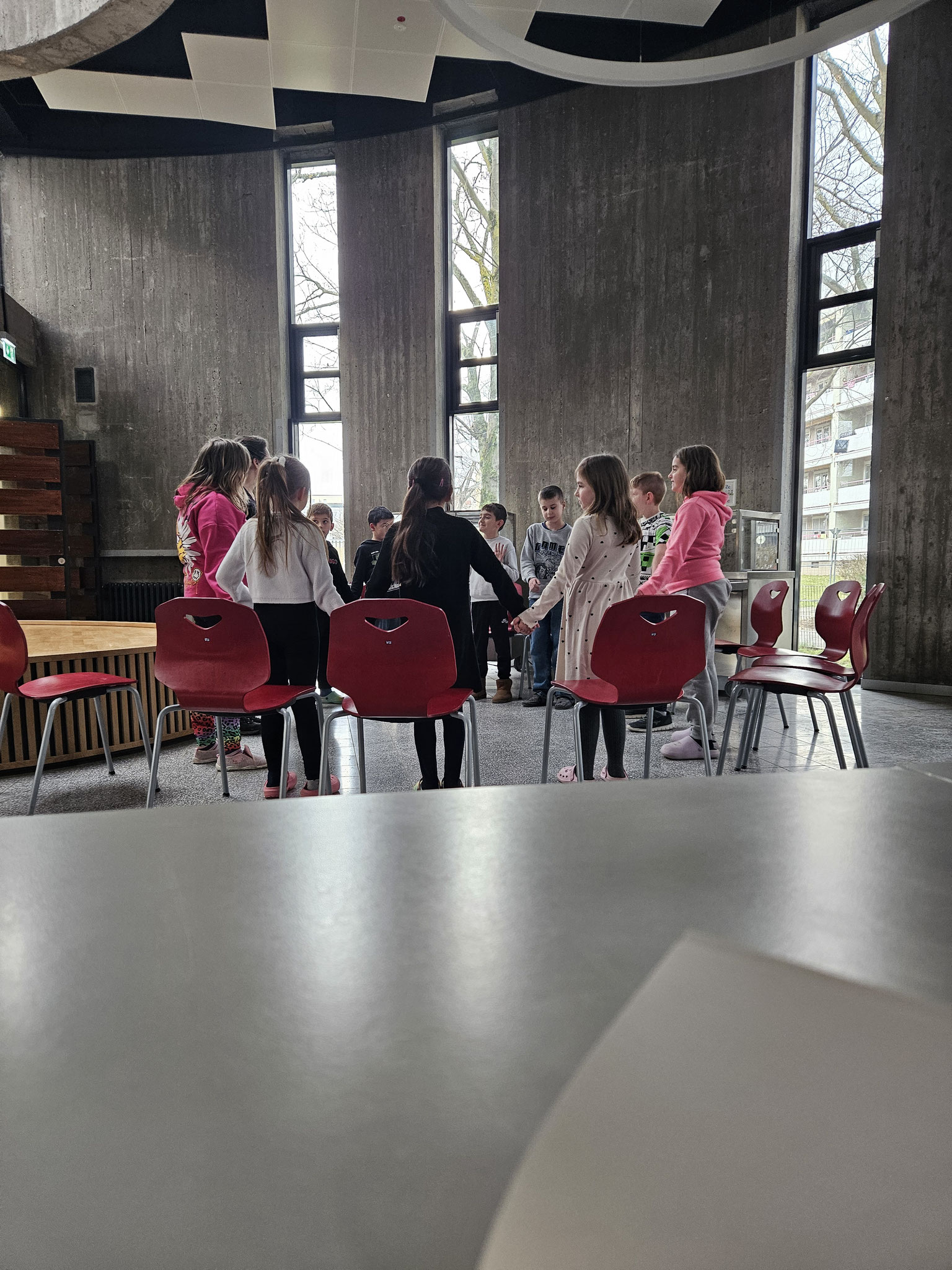 Mit MUS-E® Künstlerin Kerstin Kiefer fanden die Klassen 1a und 1c in den MUS-E® Stunden zum Thema "Gemeinsam sind wir stark!" als Gemeinschaft zusammen und stärkten ihren Zusammenhalt durch gruppenbindende Spiele und Übungen. Die Stunden wurden ritualisiert begonnen und endeten stets mit einem gemeinsamen Ruf, um der Gruppe Sicherheit und Struktur zu geben. Zu Beginn jeder Stunde versammelten sich die Schüler:innen im Bewegungskreis. Hier sagte jedes Kind seinen Namen und machte dazu eine Bewegung, die alle anderen im Chor nachmachten. So wurde die Begrüßung zu einem gemeinschaftlichen Erlebnis. Ein weiteres wichtiges Spiel war "Schön, dass du da bist", bei dem die Kinder lernten, dass das "Wie" der Kommunikation oft eine größere Wirkung hat als das "Was". Unterschiedliche emotionale Haltungen, in denen der Satz gesprochen wurde, verdeutlichten dies spielerisch und halfen, ein tieferes Verständnis für zwischenmenschliche Kommunikation zu entwickeln. Für Spaß sorgte das Spiel "Babbelbonbon", bei dem ein imaginäres Bonbon im Kreis herumgereicht wurde, das die Kinder dazu brachte, Geräusche zu machen, sobald sie es "in den Mund nahmen". Dabei durften nur Geräusche und keine Worte erzeugt werden, was für viele Lacher sorgte. Die restlichen Stunden waren mit weiteren Spielen gefüllt, die den Gruppenzusammenhalt stärkten. Beim Spiel "Au Ja!" konnten die Kinder ihre Phantasie ausleben. Sie liefen durcheinander im Raum, und ein ausgewähltes Kind rief eine Aktivität aus, die die ganze Gruppe begeistert nachmachte. Dieses Spiel förderte nicht nur die Kreativität, sondern auch das Gefühl der Selbstwirksamkeit. Beim Tiere-Raten schlüpften die Kinder in die Rolle von Tieren und drückten deren Bewegungen ohne Geräusche aus, was ihre Beobachtungsgabe und den körperlichen Ausdruck schulte. Das beliebte Stopp-Tanz-Spiel, bei dem die Kinder ihre Körpergeschicklichkeit und Aufmerksamkeit unter Beweis stellten, erreichte Kultstatus in der Klasse. Es gab sogar zwei Varianten des Spiels: eine, bei der ausgeschiedene Kinder nach kurzer Zeit wieder mitspielen durften, und eine strengere Version, bei der nur ein Kind am Ende übrig blieb. Das Projekt umfasste viele weitere Spiele, wie das Memory-Spiel mit Menschen und das Klammer-Fangspiel, die den Schüler:innen halfen, als Gruppe zusammenzuwachsen und dabei viel Spaß zu haben.