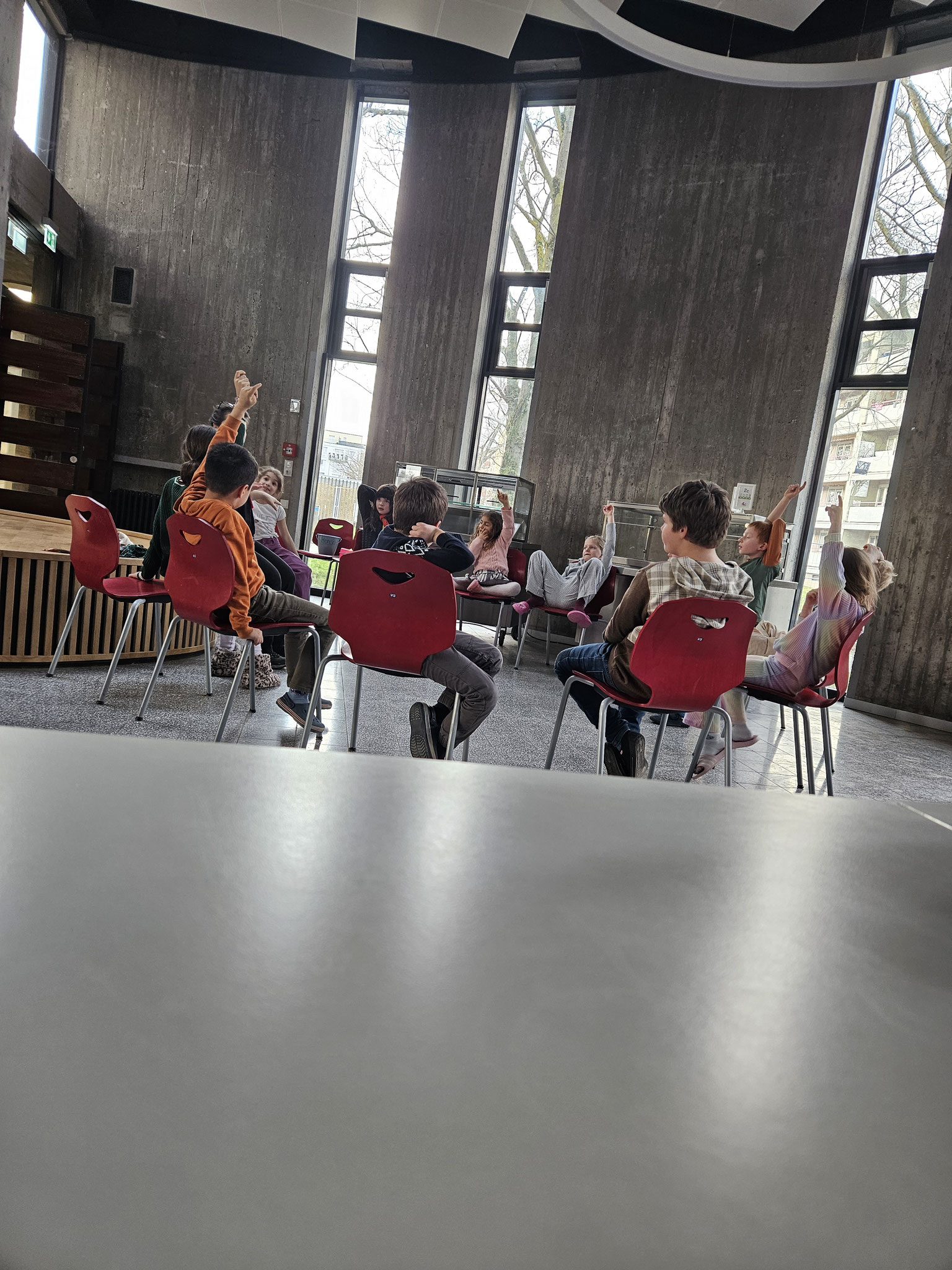 In diesem Halbjahr widmete sich die Klasse 2a dem faszinierenden Prozess des Geschichtenerzählens unter der Leitung von MUS-E® Künstlerin Kerstin Kiefer. Die Kinder näherten sich diesem Thema aus verschiedenen Perspektiven: als Autor:innen, Regisseur:innen, Schauspieler:innen sowie als Publikum. Zu Beginn des Projekts erkundeten sie gemeinsam das Geschichtenerzählen als Gruppe. Mit dem Spiel "Ja, genau! Und dann …" im Kreis fügte jede:r der Reihe nach einen weiteren Satz hinzu, um einen roten Faden in der Geschichte zu entwickeln. Dabei wurden grundlegende Fragen aufgeworfen: Für wen erzähle ich – für mich oder für andere? Wie ist eine Geschichte aufgebaut? Mit welchen Mitteln kann ich eine Geschichte erzählen, damit sie interessant ist? Diese Untersuchungen dienten dazu, das Verständnis für das Erzählen von Geschichten zu vertiefen.