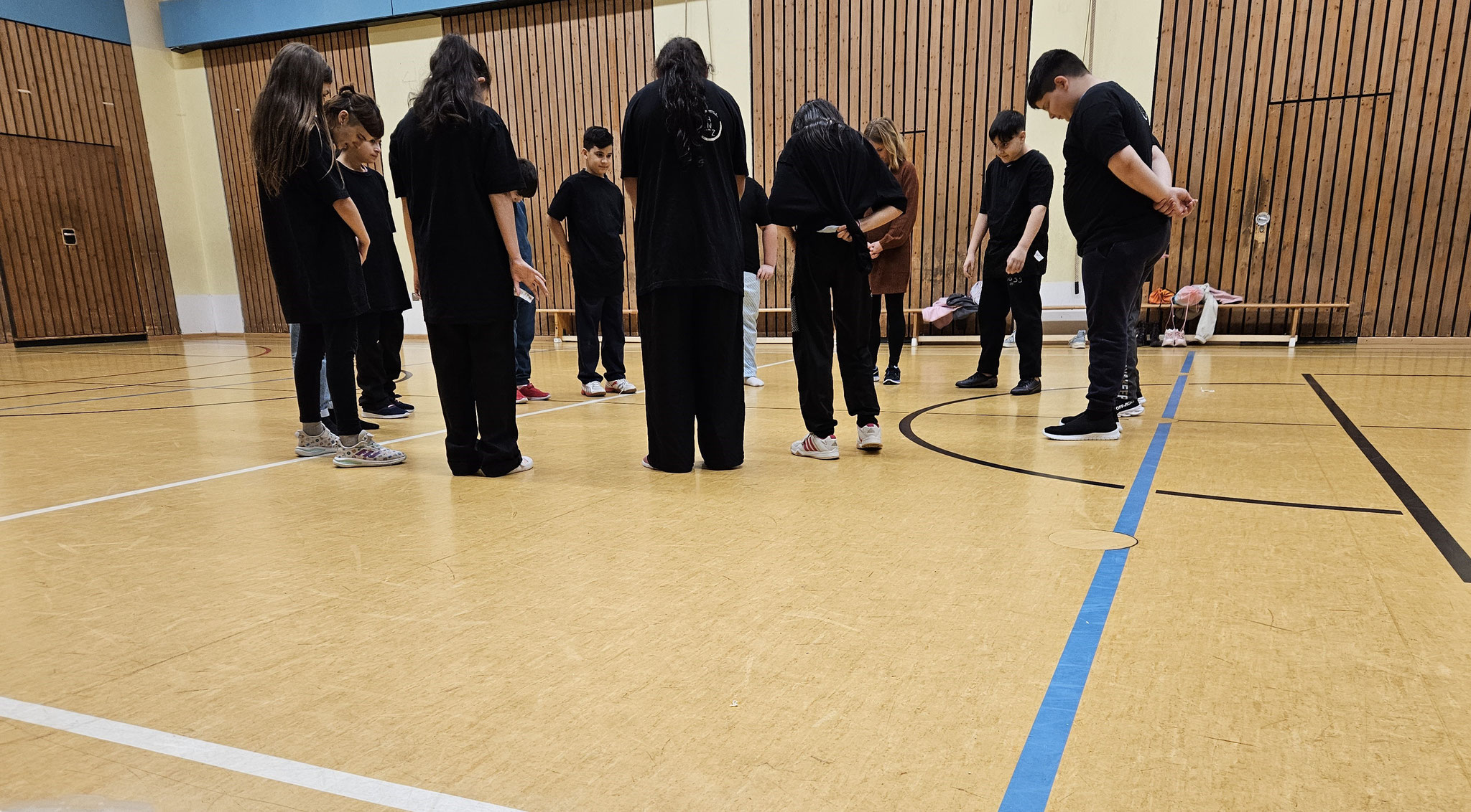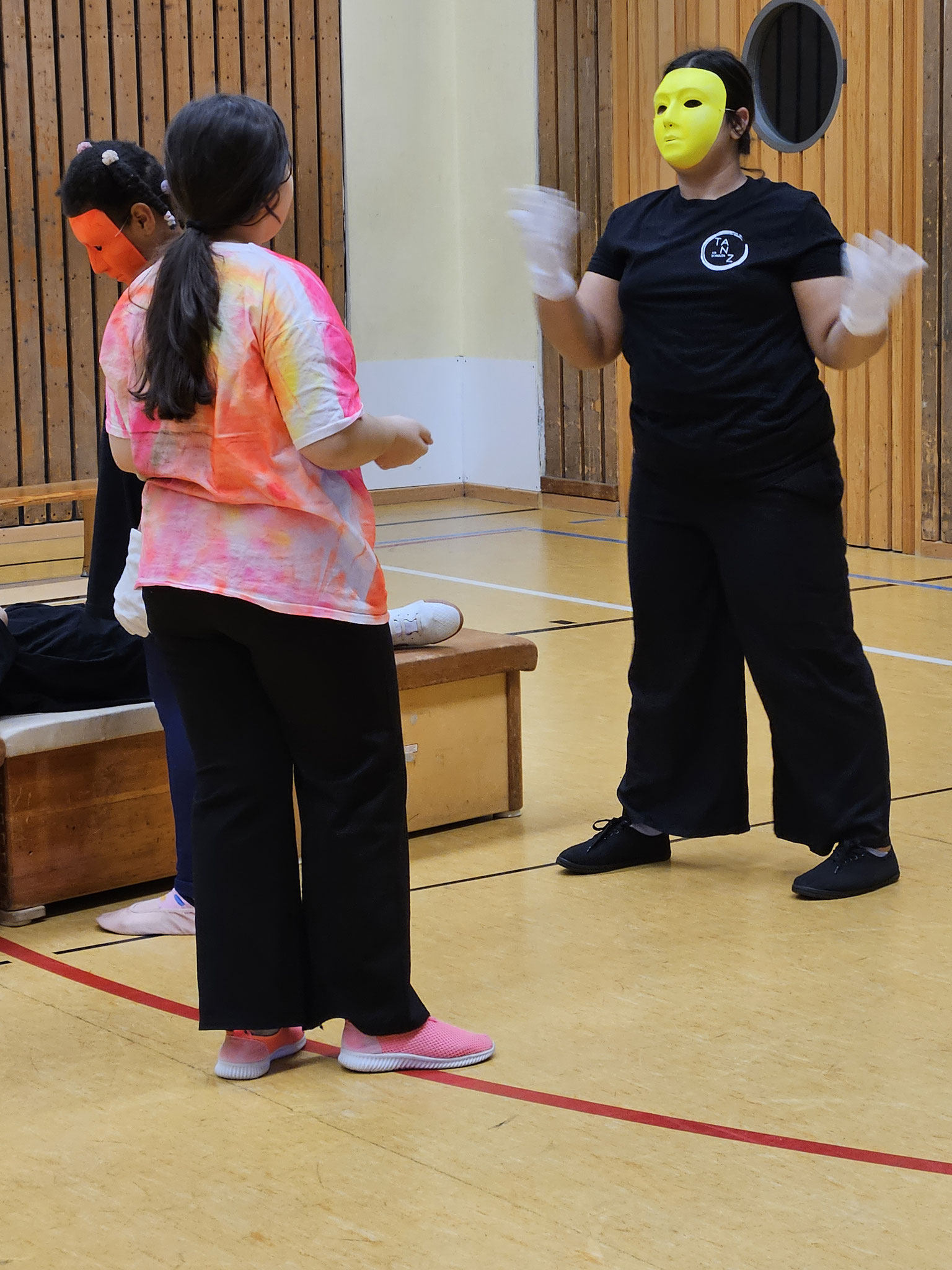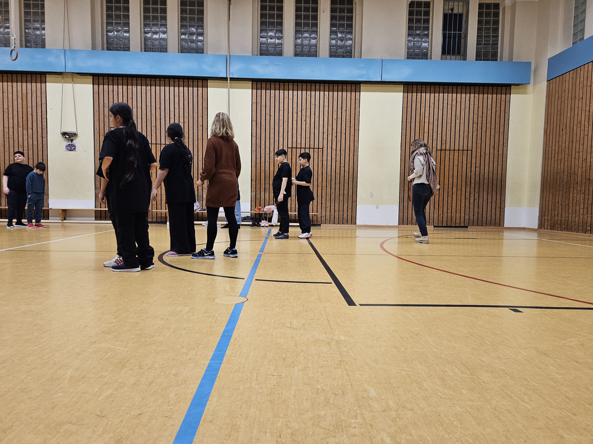 Unter der Leitung von MUS-E® Künstlerin Antonia Jäcklin entdeckten die Schüler:innen der Klassen 3 und 3/4 sowie 4 und 4/5 das Theaterspielen im Schwarzlicht auf eine ganz besondere Weise – ohne Leistungsdruck, mit viel Raum für Kreativität und Ausdruck. Da viele der Schüler:innen nur wenig Deutsch sprachen, lag der Fokus auf nonverbaler Kommunikation. Mit Mimik, Gestik und Bewegung lernten die Kinder, Emotionen auszudrücken, sich gegenseitig zu vertrauen und als Gruppe zu agieren. Durch verschiedene theaterpädagogische Methoden wie Standbilder, Improvisation und Raumläufe wurde das soziale und emotionale Lernen spielerisch gefördert.