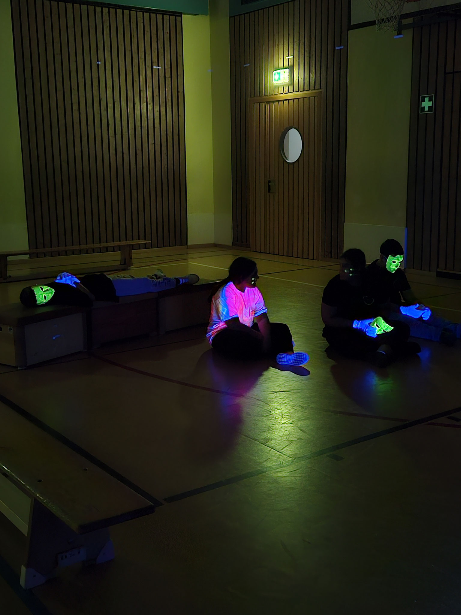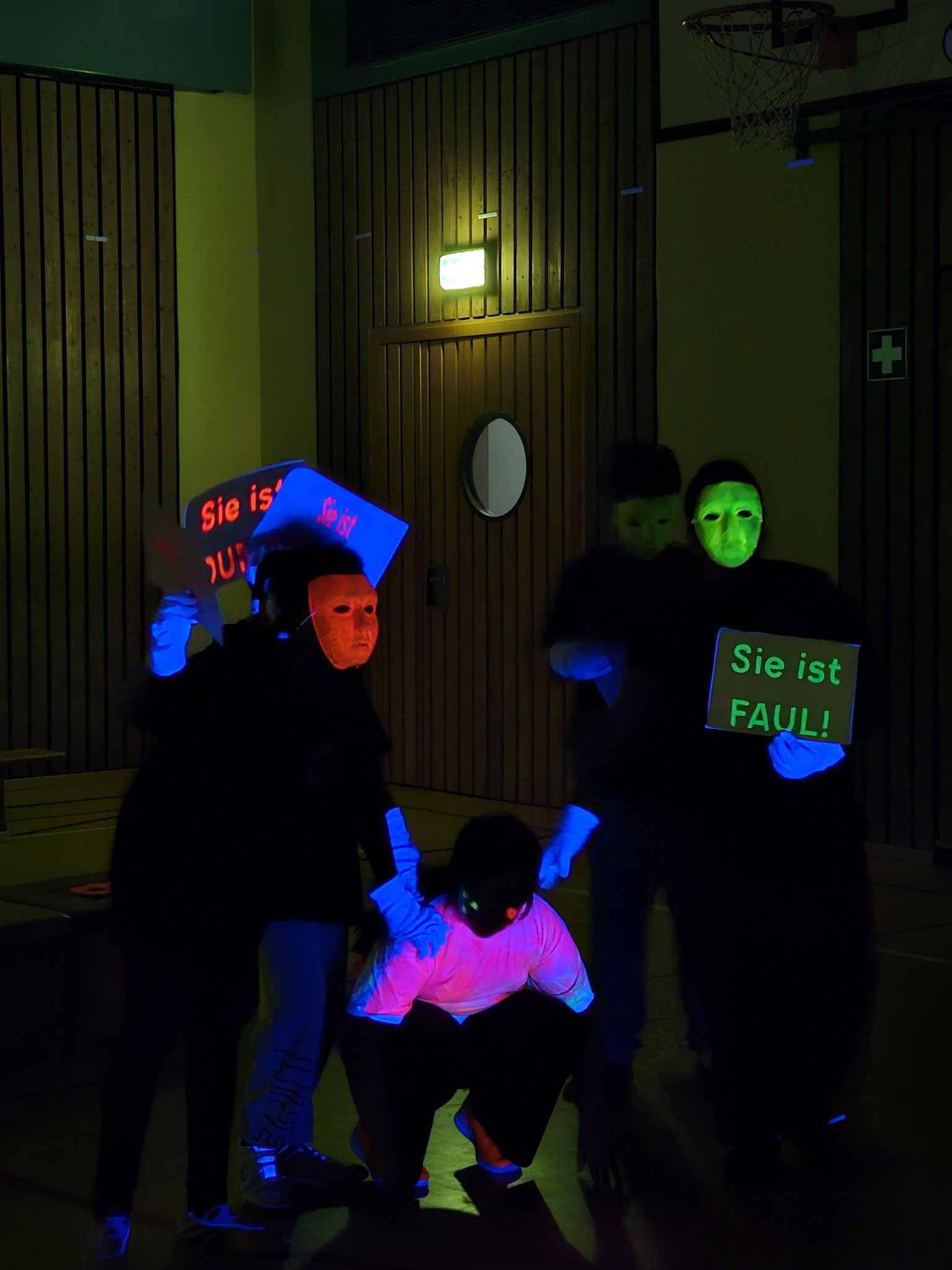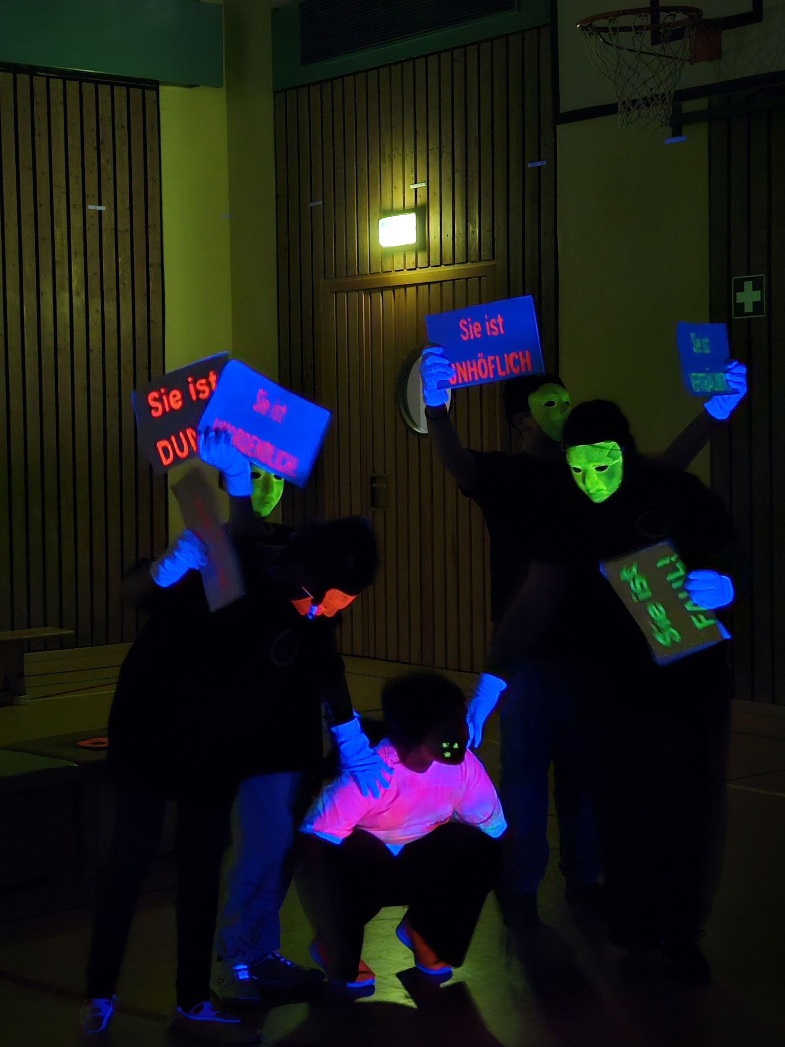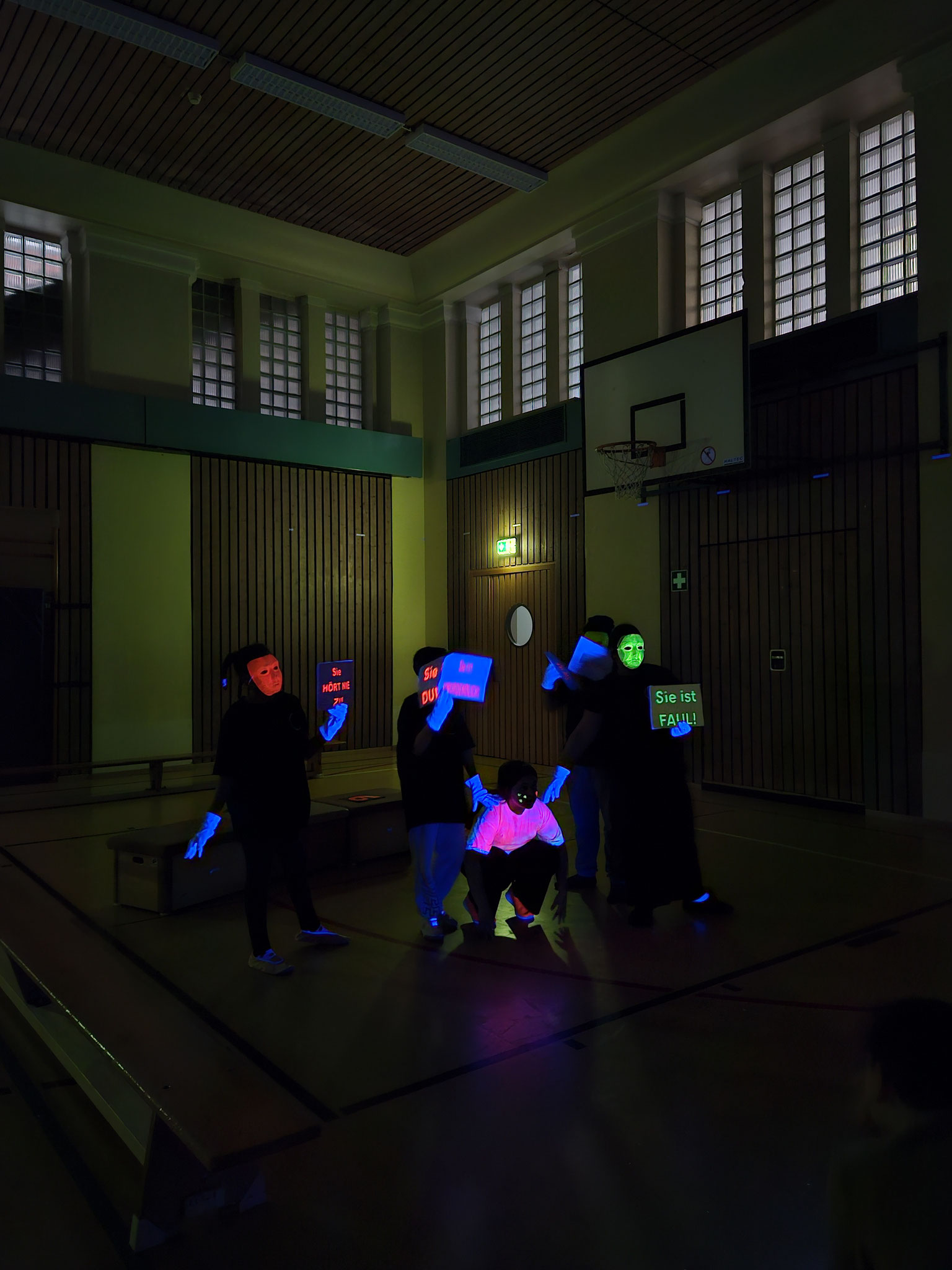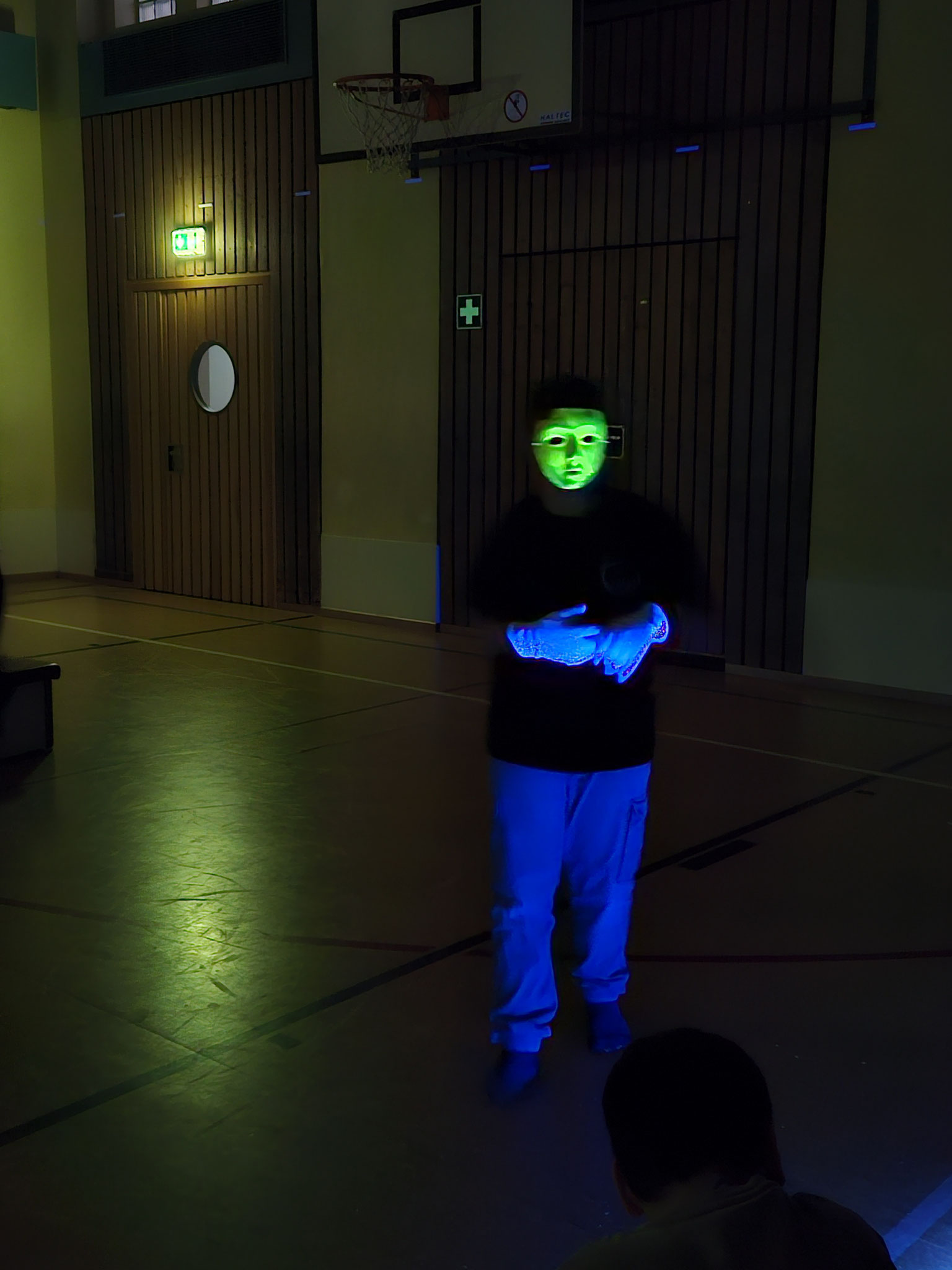 Negative Sätze wie „Du kannst nichts“ oder „Du bist zu dumm“ wurden aufgenommen und performativ umgesetzt – ebenso wie ermutigende Worte wie „Du schaffst das“ oder „Ich glaube an dich“. Diese Aussagen wurden mit Schwarzlicht-Handschuhen visualisiert, wodurch das Geben und Nehmen von Mut eindrucksvoll inszeniert wurde. Die Klasse 4/5 erschuf eine eigene Erzählung über das Mädchen Jessi, das neu an der Schule war und wegen ihres Aussehens und Verhaltens ausgegrenzt wurde. Die Mitschüler:innen hatten Vorurteile und hielten sie für „dumm“ oder „unhöflich“. Erst als ein Kind auf Jessi zuging und sie wirklich kennenlernte, änderte sich die Sichtweise der anderen. Jessi wurde durch Neonkleidung hervorgehoben, während die anderen Schüler:innen anfangs als maskierte, uniforme Masse auftraten. Als sie erkannten, dass ihre Vorurteile unbegründet waren, nahmen sie die Masken ab und zeigten darunter ihr individuelles Neon-Make-up – ein starkes Symbol für Vielfalt und Akzeptanz. Das Spiel mit Licht und Dunkelheit faszinierte die Kinder. Sie experimentierten mit Schwarzlicht und setzten es gezielt ein, um Emotionen und Botschaften zu verstärken. Um die Sprachbarriere zu umgehen, wurden wichtige Sätze vorab aufgenommen und in die Aufführung integriert. Auf Wunsch der Klassen gab es eine schulinterne Aufführung, zu der Parallelklassen und Lehrkräfte eingeladen wurden. Die Begeisterung der Zuschauer:innen zeigte, wie sehr sich die Schüler:innen mit ihren Geschichten identifizierten und wie stark das Projekt sie als Gruppe zusammengeschweißt hatte. Trotz der Herausforderungen, die durch unterschiedliche Sprachkenntnisse und soziale Hintergründe entstanden, zeigte sich schnell ein beeindruckender Klassenzusammenhalt. Das Schwarzlichttheater ermöglichte es den Schüler:innen, sich auf neue Weise auszudrücken und über sich hinauszuwachsen.