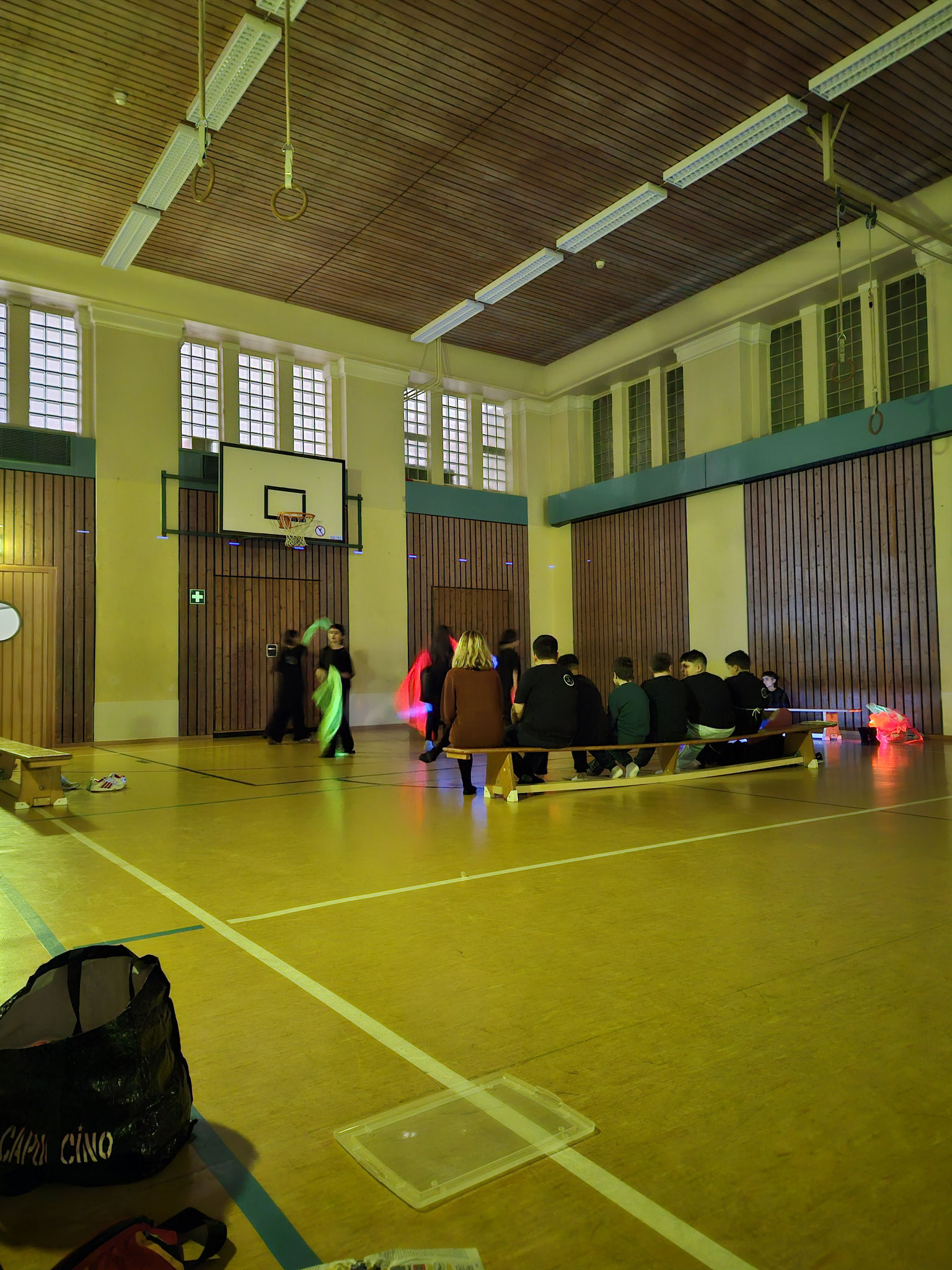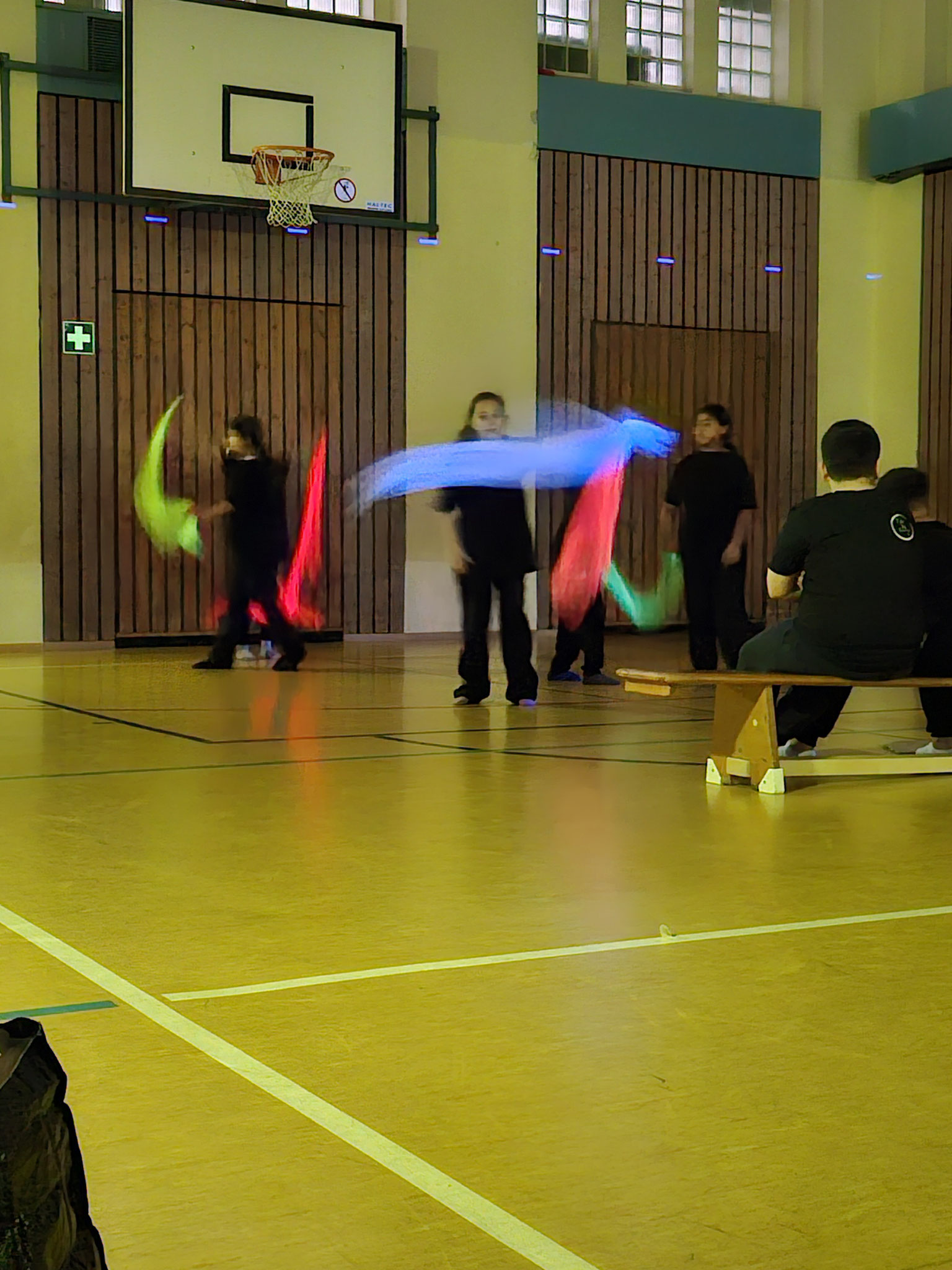 Die Schüler:innen der Klasse 4 ließen sich vom Buch "Vielleicht" von Kobi Yamada inspirieren. Besonders zwei Sätze aus dem Buch berührten sie: „Vielleicht bist du hier, um Licht an Orte zu bringen, die viel zu lange dunkel waren?“ und „Vielleicht bist du hier, um auf eine besondere Art zu helfen, wie nur du es kannst?“ Aus diesen Gedanken entwickelten sie eine Geschichte über Schmetterlinge, die gefangen, befreit und schließlich in die Freiheit entlassen wurden. Die Kinder setzten sich mit ihren eigenen Träumen auseinander, erforschten, was ihnen Mut gibt oder nimmt, und stellten diese Gefühle mit Bewegung und Schwarzlicht dar. Neon-Tücher symbolisierten die Schmetterlinge, während Neon-Seile den Käfig darstellten.