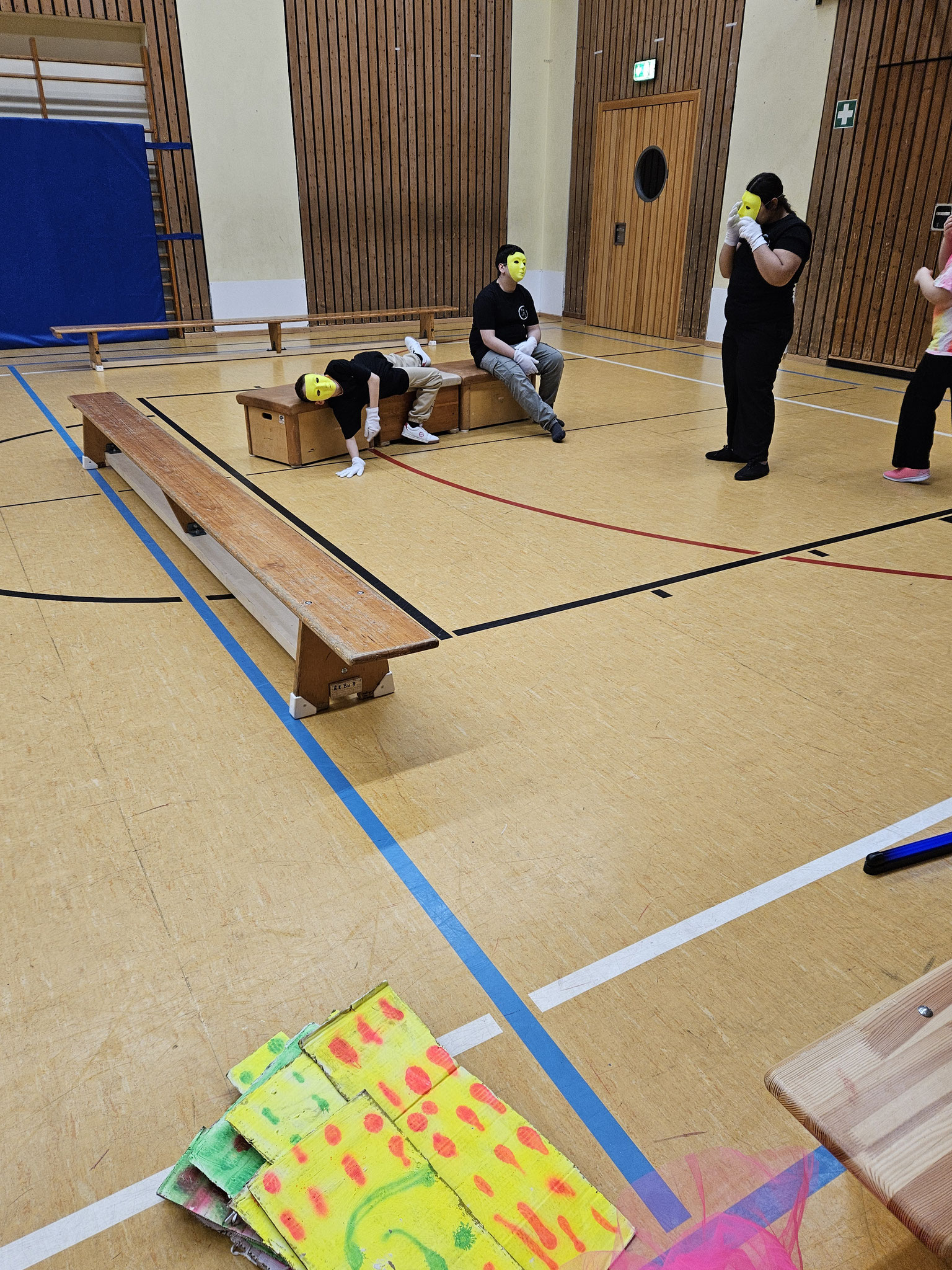 Mit den Klassen 4 und 5 führte Laura Holz ein Projekt aus der Sparte Tanz durch. Die Künstlerin kam bedingt durch Corona nur kurze Zeit in die Klasse. Erstaunlich war es jedoch, was in der knappen Zeit erarbeitet wurde. Die Kinder lernten beim Warm-up Blickkontakt mit den Partner:innen aufzunehmen und konzentriert die Bälle zuzuwerfen, was eine wichtige Voraussetzung beim Schauspiel ist, denn im sogenannten interacting muss man sich auch auf die Spielenden einlassen und auf sie reagieren. Beim Skulpturenspiel drückten die Kinder ihre Gefühle durch entsprechende Posen aus. Toll, wie man sich mit so wenigen Mitteln zu einer Figur verwandeln kann und die Turnhalle zum Theaterraum werden lassen kann. In den Vorbesprechungen wurden wichtige Begriffe des Theaters wie Fokus, Tempo, Raum und Status besprochen und bei kleinen Spielszenen umgesetzt. So entstanden eigen gespielte Geschichten, die die Kinder mittels der erlernten Theatermethoden umsetzen und ausdrücken konnten. Zum Abschluss brachten die Kinder ihre Freude beim Theaterspiel zum Ausdruck, in dem sie ihren Lieblingsmoment beschreiben.