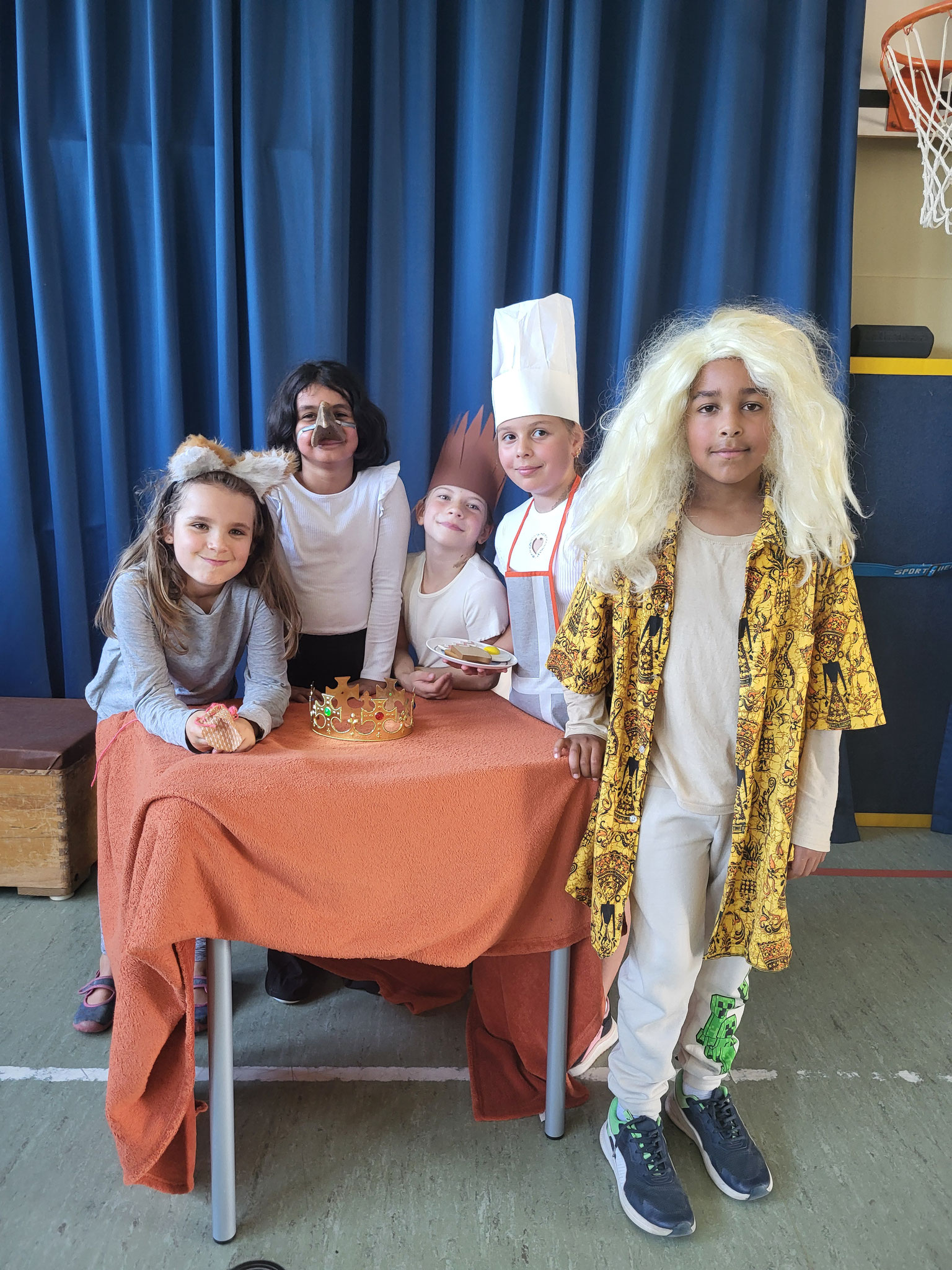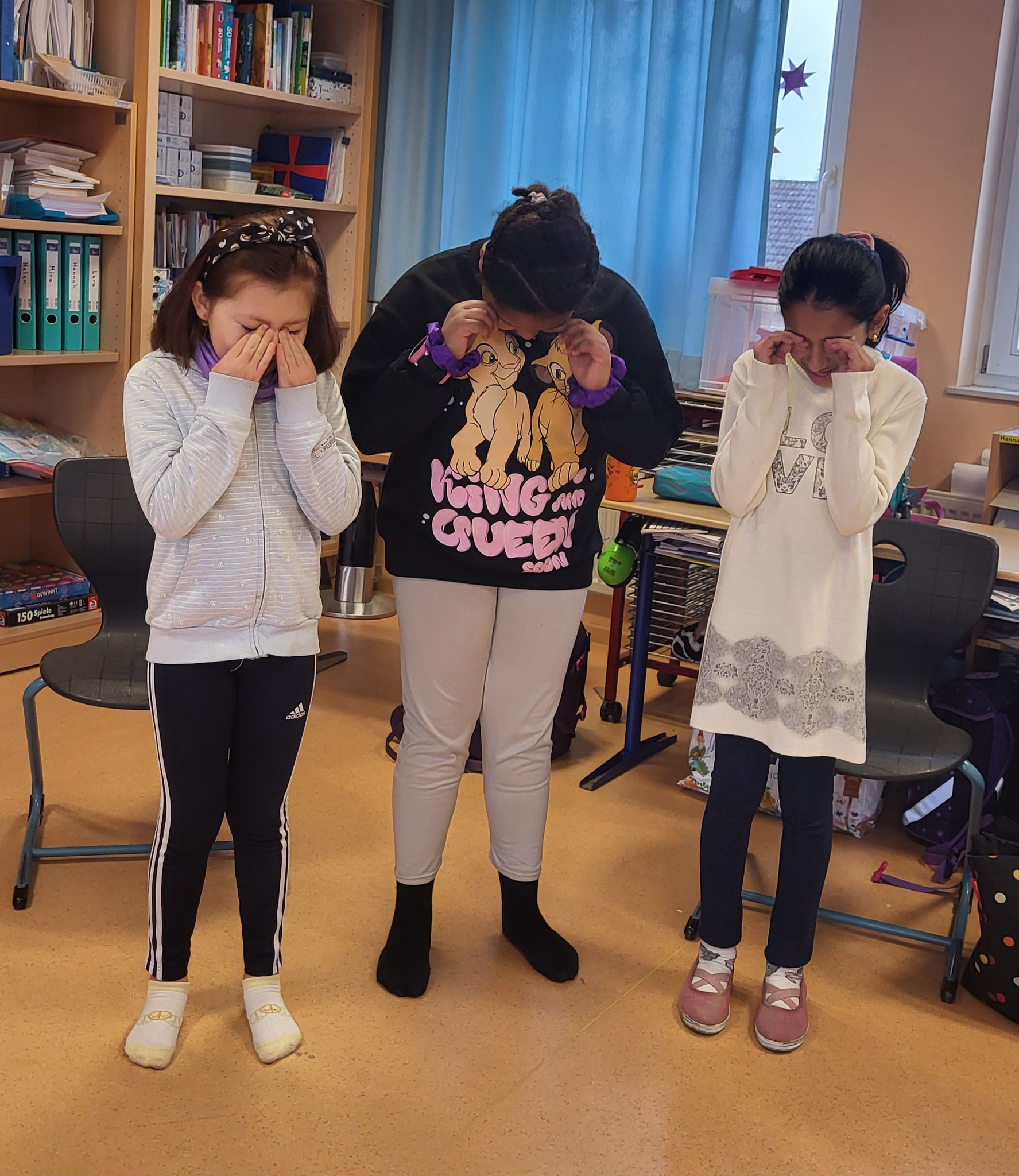 Das Projekt "Theater" mit MUS-E® Künstler Fabian Guillery hatte zum Ziel, den Schüler:innen der Klasse 3a Grundlagen des Theaterspielens zu vermitteln, die sie in einem selbst entwickelten Stück aufführen konnten. Da Klassenlehrerin Karin Becker schon viele theaterbezogene Projekte mit ihrer Klasse durchgeführt hatte, gab es schon eine gute Basis, auf der gemeinsam aufgebaut wurde. Zunächst wurde mit Kennenlern- und Gruppenspielen begonnen, um die Kinder „spielfähig“ zu machen. Anschließend folgten schauspielerische Übungen und Spiele, um die darstellerischen Fähigkeiten zu erweitern. In der zweiten Phase stellten die Kinder Bilder nach, die sie zu kleinen Geschichten erweiterten, die alle aufgegriffen und in einem Stückplot zusammengeführt wurden. Heraus kam eine Krimigeschichte, auf Wunsch der Kinder mit Tierfiguren, was half den Rollen starke Charakterzüge und klar definierte Körperlichkeit zu geben. Die Szenen wurden durch Improvisation entwickelt und die Rollen soweit möglich den Wünschen der Kinder verteilt. Die Kinder waren bei den nun folgenden Proben immer mit Begeisterung dabei und brachten sich motiviert mit Ideen ein. Abschluss und Höhepunkt war die Aufführung vor Publikum.
