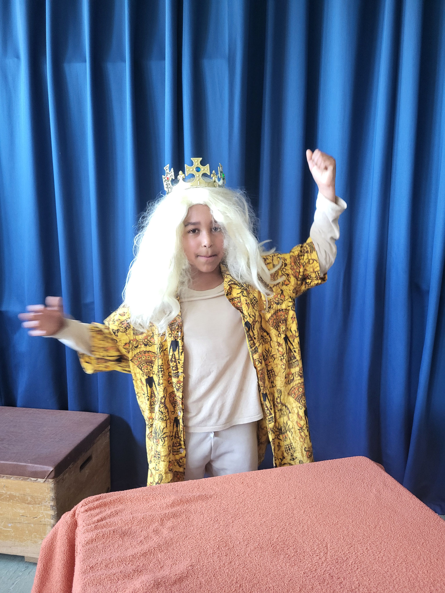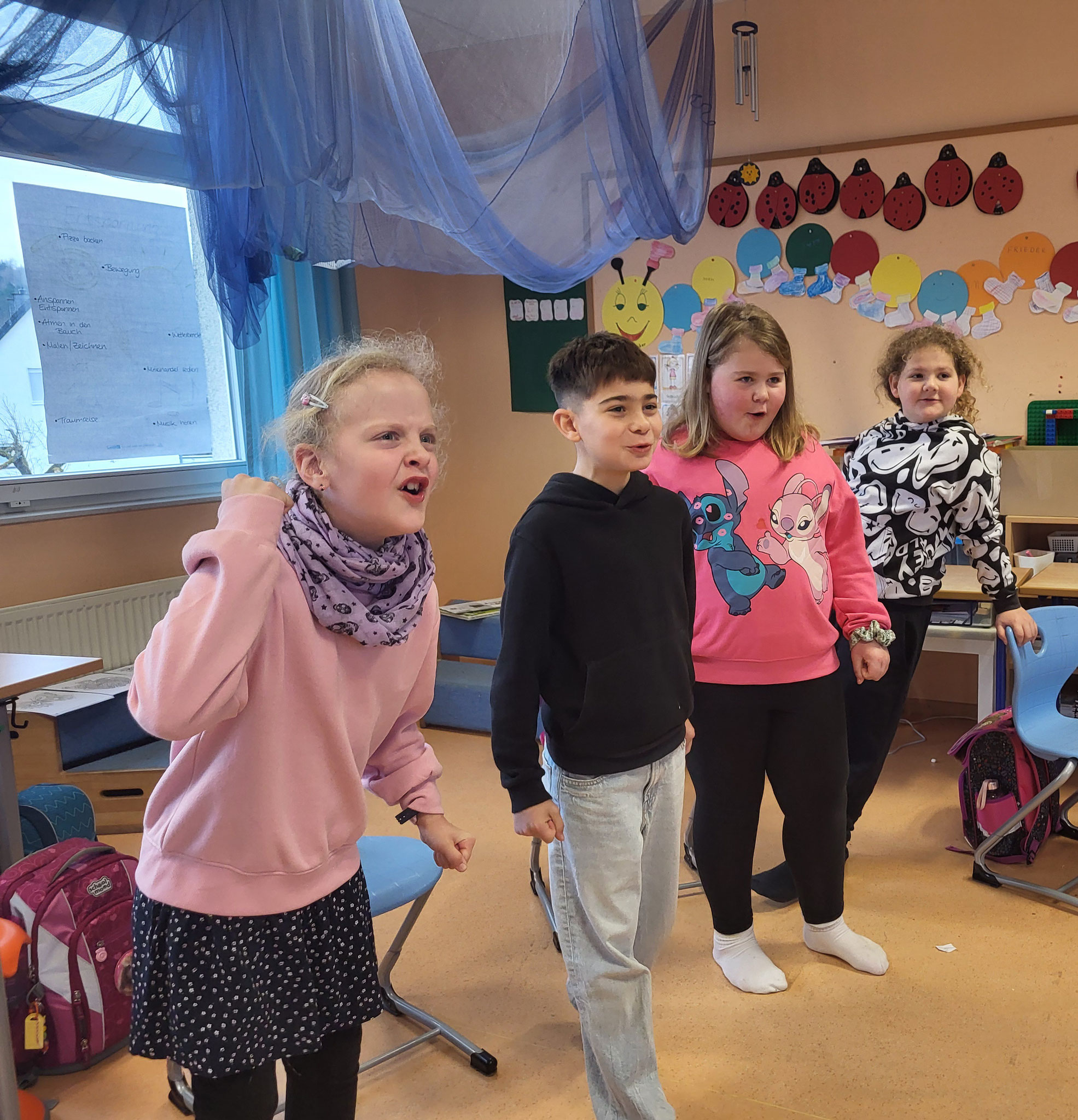 Im weiteren Verlauf des Projekts wurden die Schüler:innen durch gezielte schauspielerische Übungen in verschiedene darstellerische Techniken eingeführt. Diese Übungen halfen den Kindern, ein breites Repertoire an Ausdrucksmöglichkeiten zu entwickeln und ihre Kreativität sowie ihr Selbstbewusstsein zu fördern. In der zweiten Phase des Projekts wurde dann auf kreative Weise eine Geschichte entwickelt. Mit Hilfe von Symbolen erfanden die Kinder eine eigene Geschichte, die sie anschließend improvisierend auf die Bühne brachten. Nachdem das Stück konzipiert war, wurden die Rollen sorgfältig verteilt. Dabei wurde besonders darauf geachtet, dass jedes Kind eine Rolle erhielt, die seinem Interesse entsprach. Diese Herangehensweise förderte die individuelle Entfaltung und sorgte dafür, dass alle Kinder sich mit ihren Aufgaben identifizieren konnten. Eine besondere Entscheidung des Projekts war, das Stück als Live-Hörspiel aufzuführen. Dadurch konnten auch jene Kinder, die sich nicht aktiv auf der Bühne zeigen wollten, in das Projekt integriert werden. Sie konnten als Geräuschmacher:innen und Atmosphärengestalter:innen aktiv zur Szene beitragen und lernten so, wie wichtig jedes Element einer Theaterproduktion ist. Die Kinder zeigten während des gesamten Projekts große Begeisterung und Engagement. Selbst in Phasen, die eine längere Konzentration erforderten, blieben sie motiviert und arbeiteten mit viel Freude am gemeinsamen Ziel. Der Höhepunkt des Projekts war zweifellos die Aufführung vor den Eltern, bei der die Schüler:innen ihr Können und die Früchte ihrer intensiven Probenarbeit präsentieren konnten. Die Vorstellung war ein voller Erfolg, und die Zuschauer:innen waren begeistert von der Leistung der Kinder.
