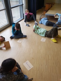 Zu Beginn haben die Klasse 3a und MUS-E® Künstlerin Nadja Monnet sich dem Thema „Ordnungen“ über den eigenen Körper angenähert. Auf spielerische Aufstellungen nach verschiedensten Kriterien folgten ein Körperalphabet und ein kreiertes Muster, welches mit dem geworfenen Schatten der eigenen Körper entworfen wurde. In all diesen Vorübungen ging es darum, sich in Ordnungen hineinzubegeben, sie zu erleben und zu erkennen.