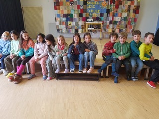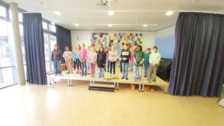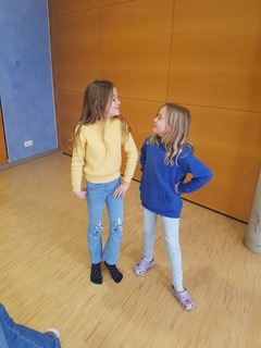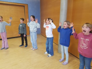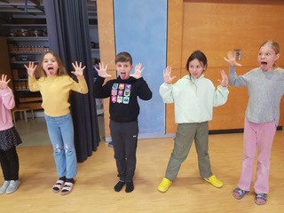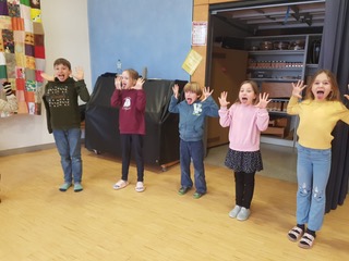 Zum Ende der MUS-E® Zeit bereiteten die Kinder ein weiteres Bühnenstück vor, das am Halbjahresende aufgeführt wurde. Während der Proben wurden vielfältige Kompetenzen gefördert: neben Teamfähigkeit, Präsenz, Ausstrahlung, Haltung und Aussprache auch Ausdauer, Geduld, kreative Mitgestaltung und die Entwicklung eigener Szenen. Die Wirkung zeigte sich unmittelbar im Schulalltag. Die Kinder waren aufmerksamer und präsenter. Beobachtungsgabe, Zuhören, die Wahrnehmung eigener Gefühle und der Körpersprache verbesserten sich deutlich. Anfangs fiel es vielen schwer, sich zu fokussieren, doch im Verlauf des Projekts gelang es ihnen immer besser, sich auch in ruhigen Momenten auf sich selbst zu konzentrieren. Die freien Improvisationen brachten viel Freude und stärkten den Zusammenhalt.