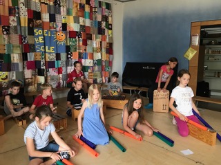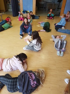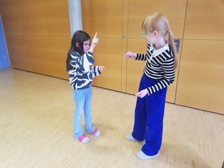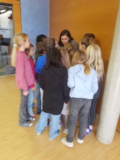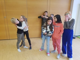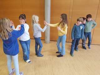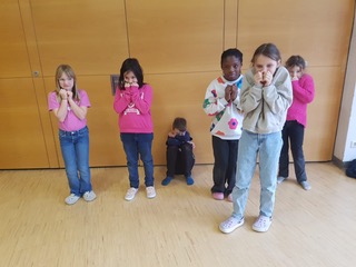 Im Vordergrund des Theaterprojekts mit MUS-E® Künstlerin Claudia Kraus standen die Freude am eigenen Ausdruck, das Zusammenspiel miteinander und das Hineinschlüpfen in verschiedenste Rollen. Ergänzend wurde immer wieder mit den Kindern gesungen und kleine Rhythmusspiele gespielt. Jede MUS-E® Stunde begann und endete mit einer selbst erfundenen Zeitmaschine, welche die Kinder ins Theaterland und wieder zurück brachte. Spielerisch wurde sich zunächst dem Statuentheater genähert. Dabei dachten sich die Kinder z. B. Standbilder zu bekannten Märchen aus, anhand derer die anderen erraten konnten, um welches Märchen es sich handelte. Neben Pantomime-Übungen haben die Kinder nach und nach eigene kleine Szenen improvisiert und einander gezeigt, wie z. B. das Finden einer Flaschenpost, das Entdecken der Botschaft und welche Geschichte sich daraus entwickelt.