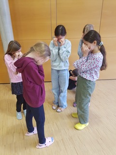 Dort entstanden in Kleingruppen beeindruckende Szenen, die von großem Einfühlungsvermögen geprägt waren, und immer wieder zeigte sich das Motiv „Ich helfe den anderen“. Diese Erfahrung wurde anschließend in die Schule übertragen. Dort probten die Kinder ihre Szenen weiter und beschäftigten sich mit grundlegenden Fragen: Was ist eigentlich eine Geschichte? Was versteht das Publikum? Mit viel Geduld und Durchhaltevermögen verbesserten sie Schritt für Schritt die Klarheit ihrer Bewegungen und die Wirkung des Blicks. Im weiteren Verlauf verbanden sich die einzelnen Szenen zu einem ganzen Stück. Mit Hilfe von Verbindungselementen, einer „magischen Kugel“ und ergänzenden Rollen entstand eine stimmige Aufführung. Die Schüler:innen wuchsen in ihrer Ausdrucksfähigkeit sichtbar über sich hinaus. Besonders beeindruckend war, wie sehr sie einander unterstützten und gemeinsam Verantwortung für ihr Stück übernahmen. Am Ende stand eine Präsentation, die vom Publikum begeistert aufgenommen wurde.