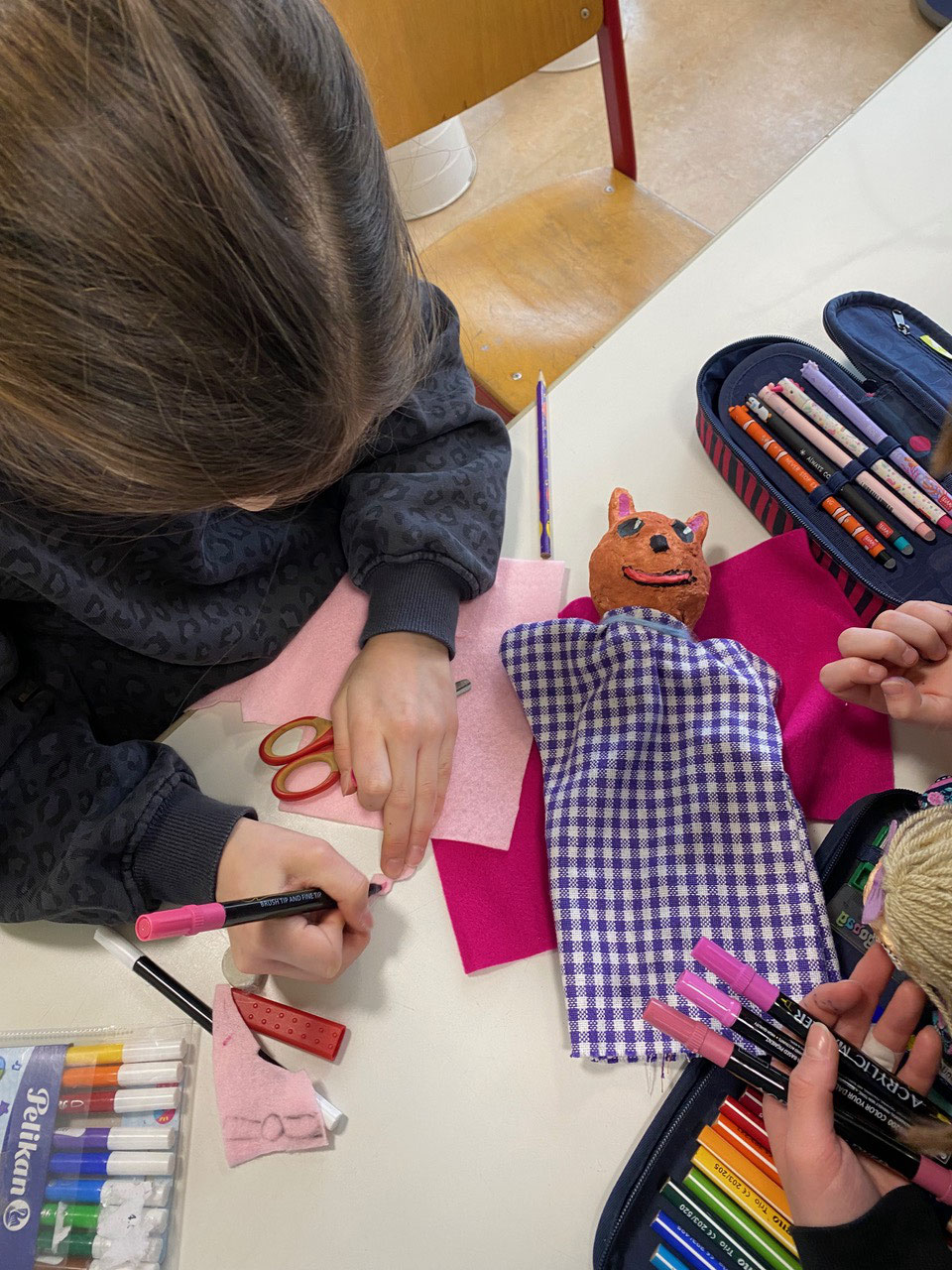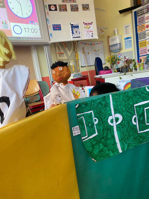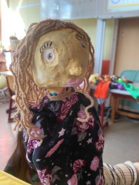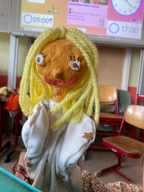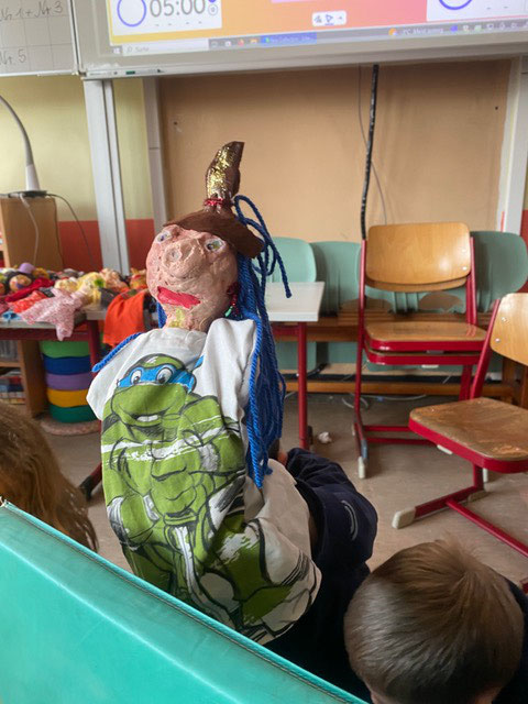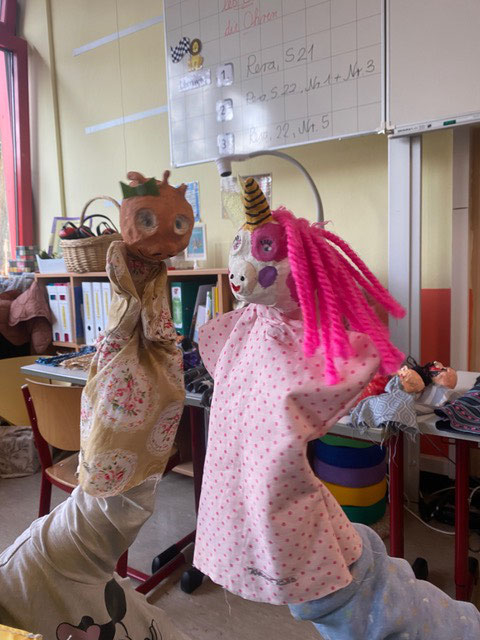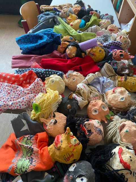 Im Projekt "Handpuppenbau und Improvisationstheater" mit MUS-E® Künstlerin Maike Erdudatz gestalteten die Kinder der Klassen 3.1, 3.2 und 3.3 eigene Handpuppen nach ihren Wünschen und kreativen Vorstellungen. Um Ideen zu sammeln, entwickelten die Schüler:innen zunächst verschiedene Entwürfe anhand der Tipps und Tricks der Künstlerin. Gesichtszüge, verschiedene Hauttypen, Frisuren und Hüte kamen hierbei ins Spiel. Es entstanden wunderbare und individuelle Handpuppen, ganz nach dem Geschmack des jeweiligen Kindes. Vom Groben ins Feinteilige entwickelten sich auch die Charaktere der Handpuppen, die im zweiten Abschnitt des Projektes besonders beachtet wurden, bei dem in Kleingruppen individuelle Theaterstücke entwickelt wurden. Zum Abschluss zeigten alle Schüler:innen ihr Theaterstück den anderen dritten Klassen unter freiem Himmel und mit einer kleinen selbstgebauten Bühne. Selbst Mark Forster hatte zweimal seinen Auftritt auf der Bühne – ein wunderschöner Abschluss des Projektes.