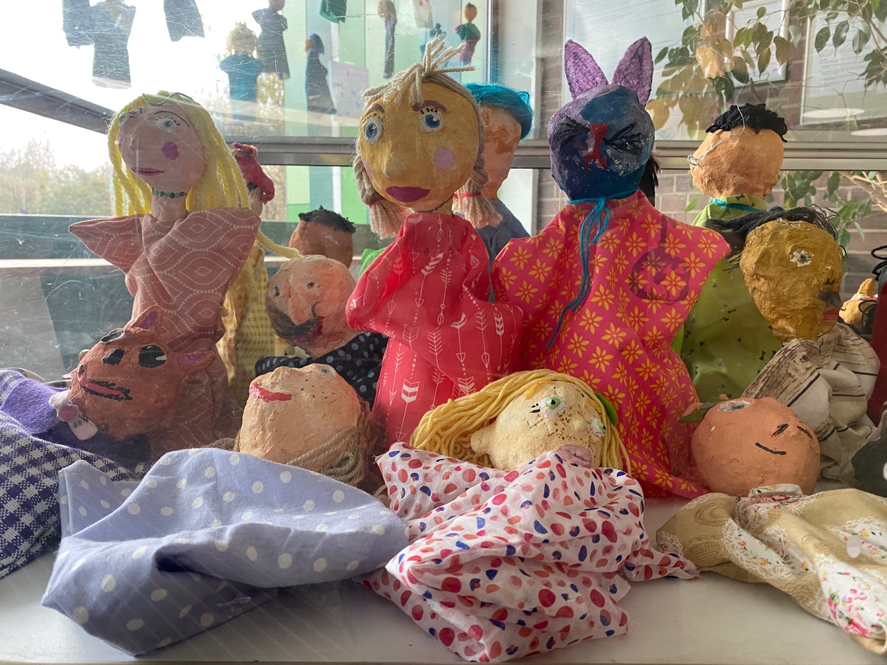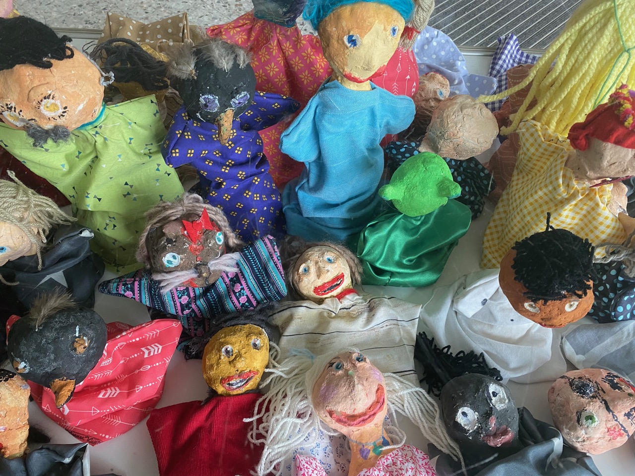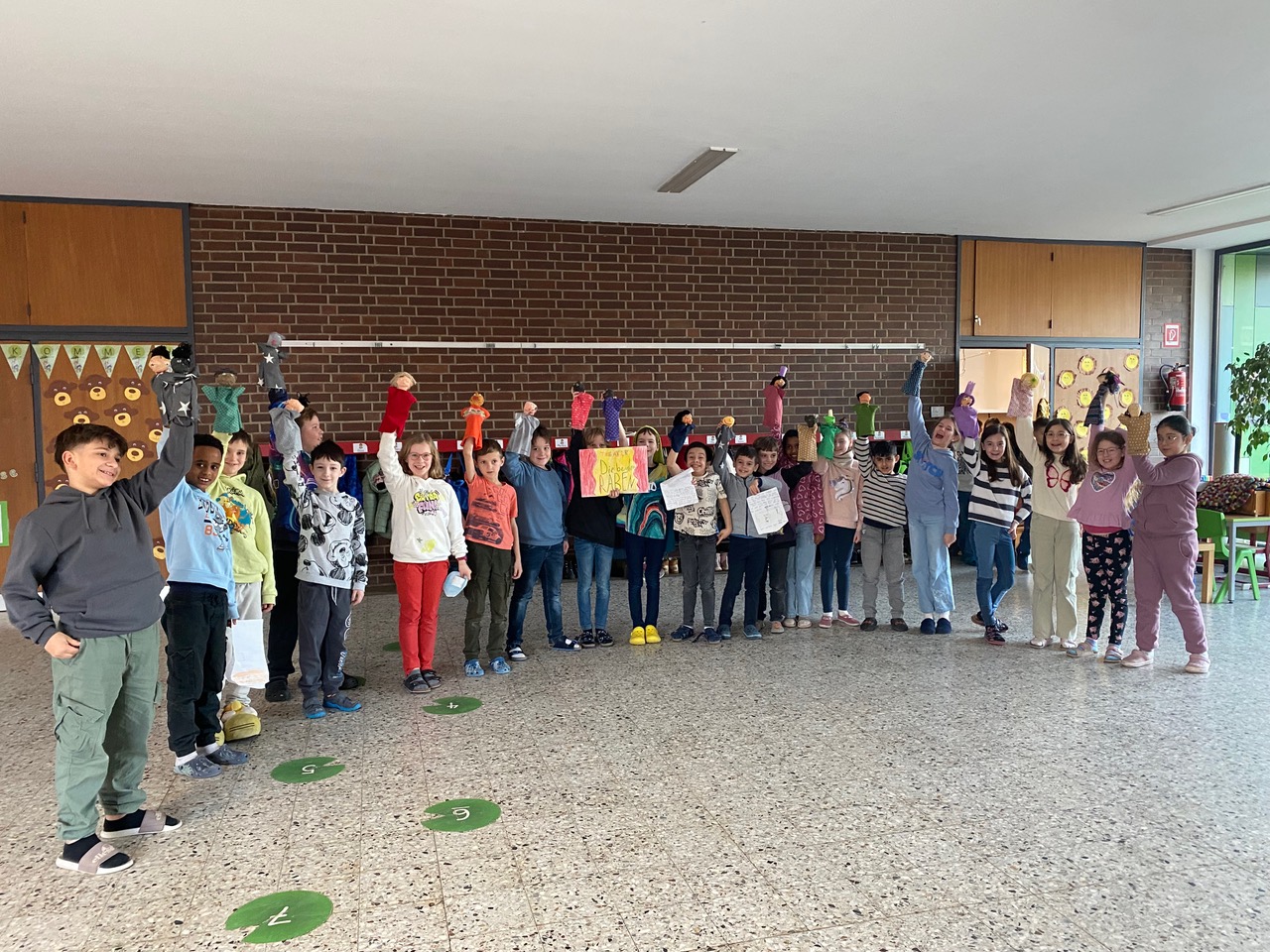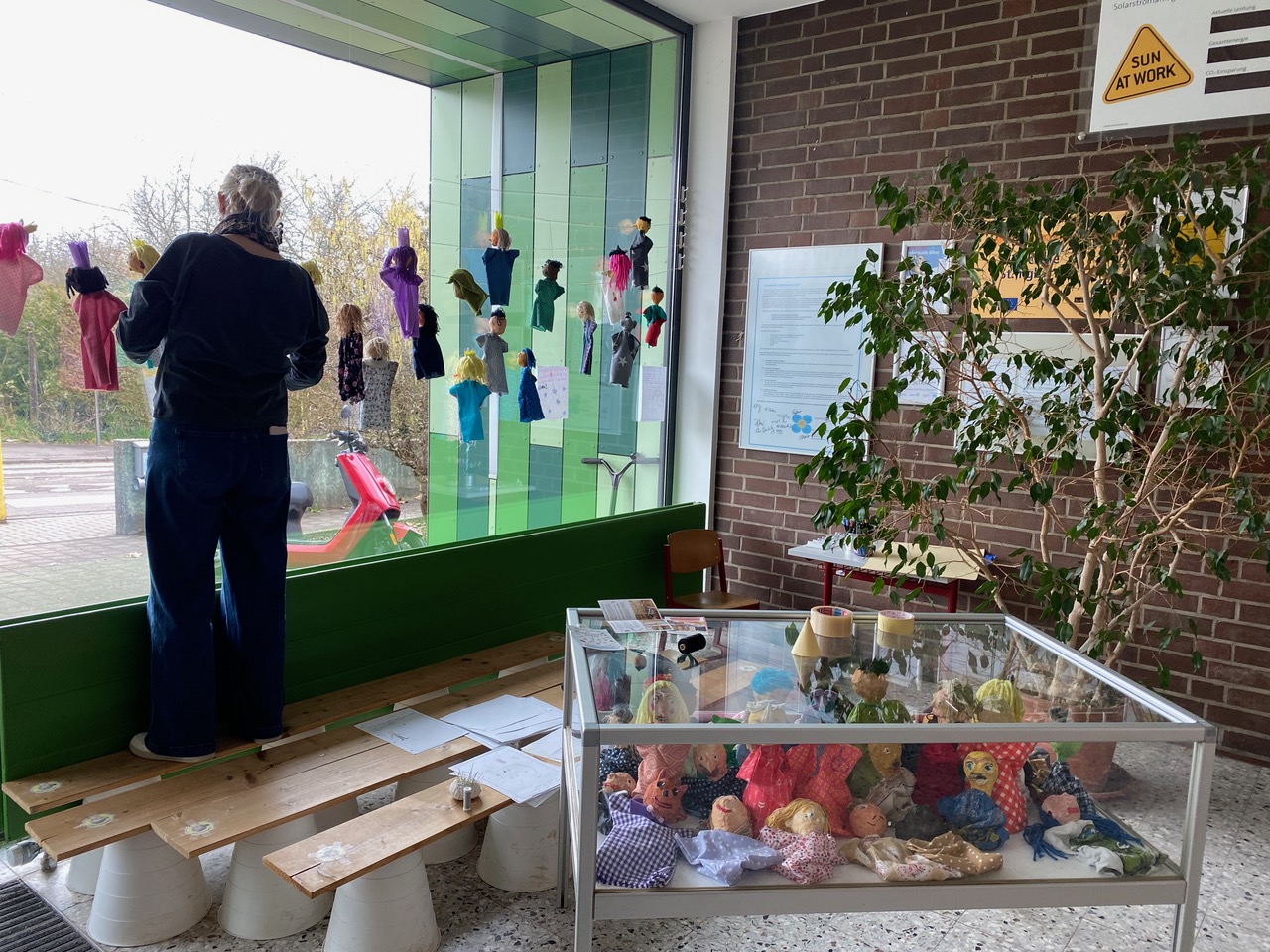 Handpuppen nach eigenen Ideen zu gestalten und damit ein selbstgeschriebenes kleines Theaterstück zu spielen hat im 2. Schulhalbjahr 22/23 so großen Anklang gefunden, dass auch die jetzigen 3. Klassen (3b, 3c, 3d) sich dieses Projekt mit MUS-E® Künstlerin Meike Erdudatz gewünscht haben. Passend zu den entstandenen Charakteren der Handpuppen entwickelten die Kinder in Kleingruppen diesmal ihre Theaterstücke zum Thema „Wir sind eine Welt“. So wurden kreative Geschichten zu Hobbys, Freund:innen und Schule geschrieben oder sich mit eigenen Wünschen und Phantasien auseinandergesetzt. Zum Abschluss wurden die Stücke den jeweils anderen 3. Klassen in einer Aufführung präsentiert. Zusätzlich entstand eine Ausstellung im Eingangsbereich der Südschule, sodass alle Schüler:innen, Besucher:innen und Eltern die einzigartigen, individuellen Handpuppen bestaunen konnten.