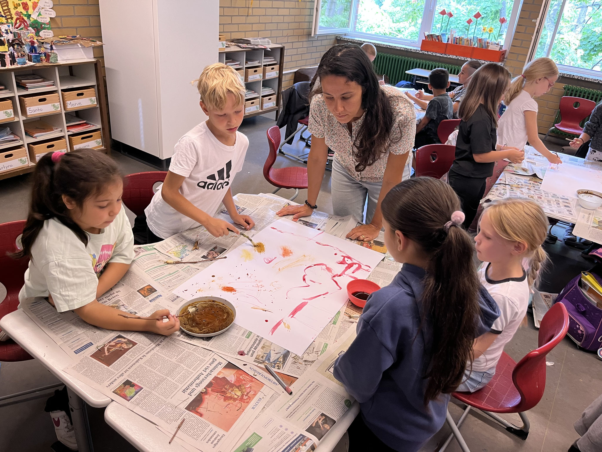 Die Kinder einer dritten Klasse stellten unter Anleitung der Bildenden Künstlerin Cynthia Haag zunächst individuelle Pinsel aus Naturmaterialien her und probierten diese anschließend in einer freien Malphase aus. Ein Mädchen rief dabei immer wieder begeistert: „Das ist ein Kunstwerk!“ Schulleiterin Theresia Böhl hob hervor: „Wir haben MUS-E® seit einem Jahr an drei Klassen und sehen, wie gut es den Kindern tut. Wir sehen ganz viele Fortschritte – vor allem, dass sie ihre Gefühle besser ausdrücken können. Das ist so wichtig!“